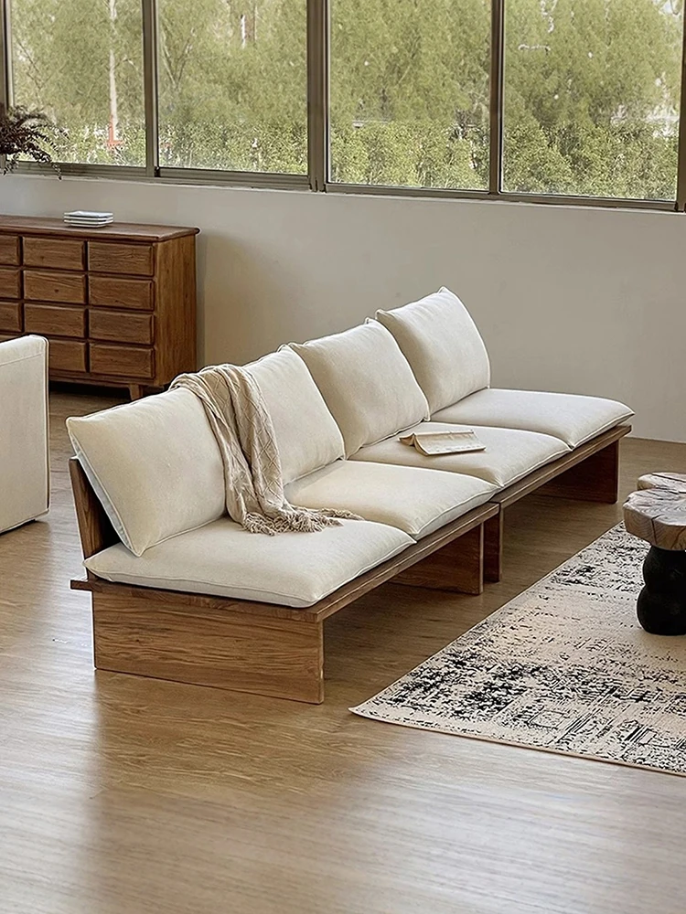 無垢材の侘び寂びスタイル!小型住居にぴったりの洗える実木ソファ。二人掛け、三人掛けのデザインで、リビングや民宿の休憩エリアにも最適。ゲストを心地よく迎える、スタイリッシュな一品です!
