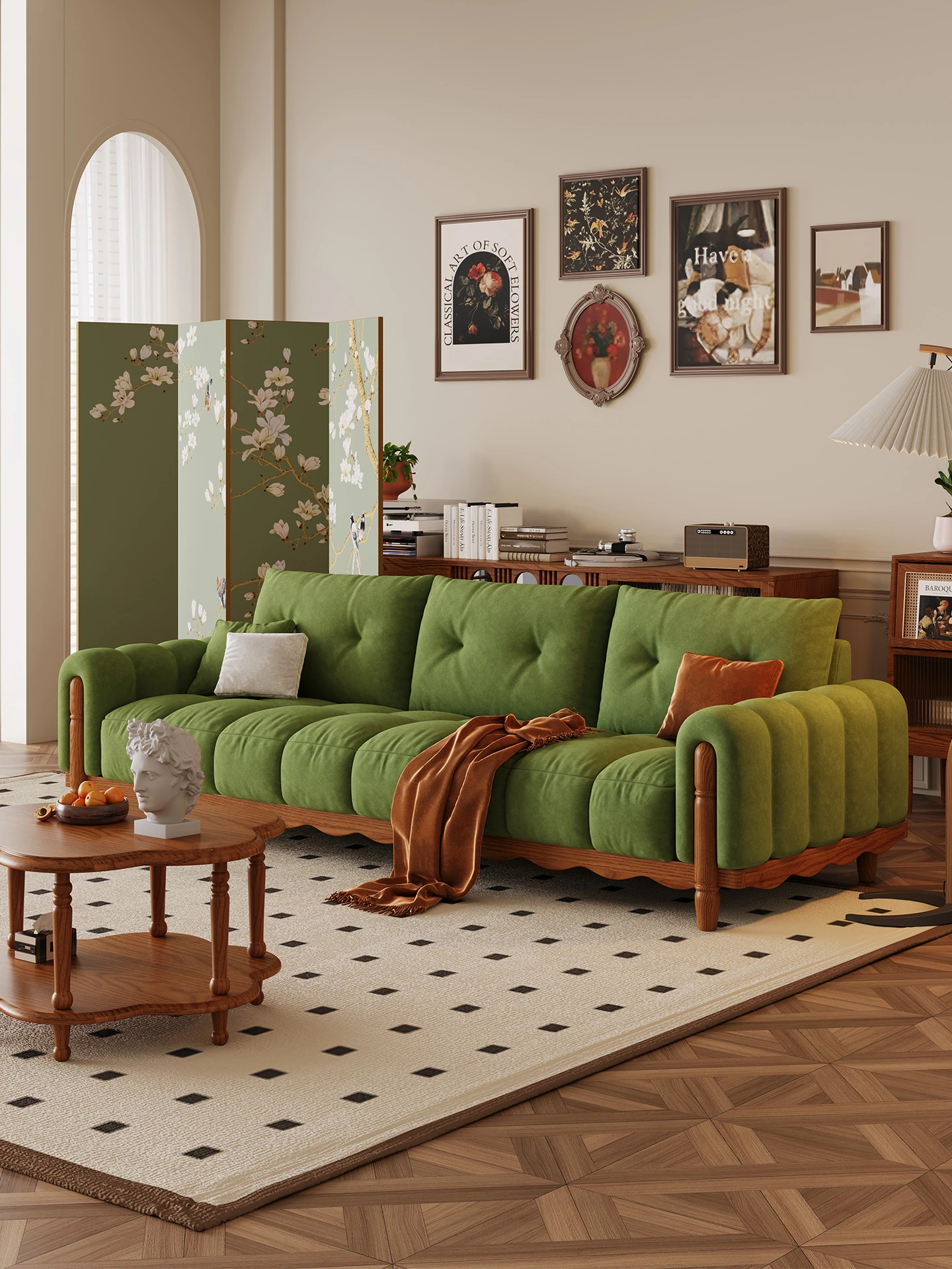 Vintage French Style Plush Fabric Sofa for Baby - 2024 New Solid Wood Green Multi-Seat Sofa for Retro Living Room Decor