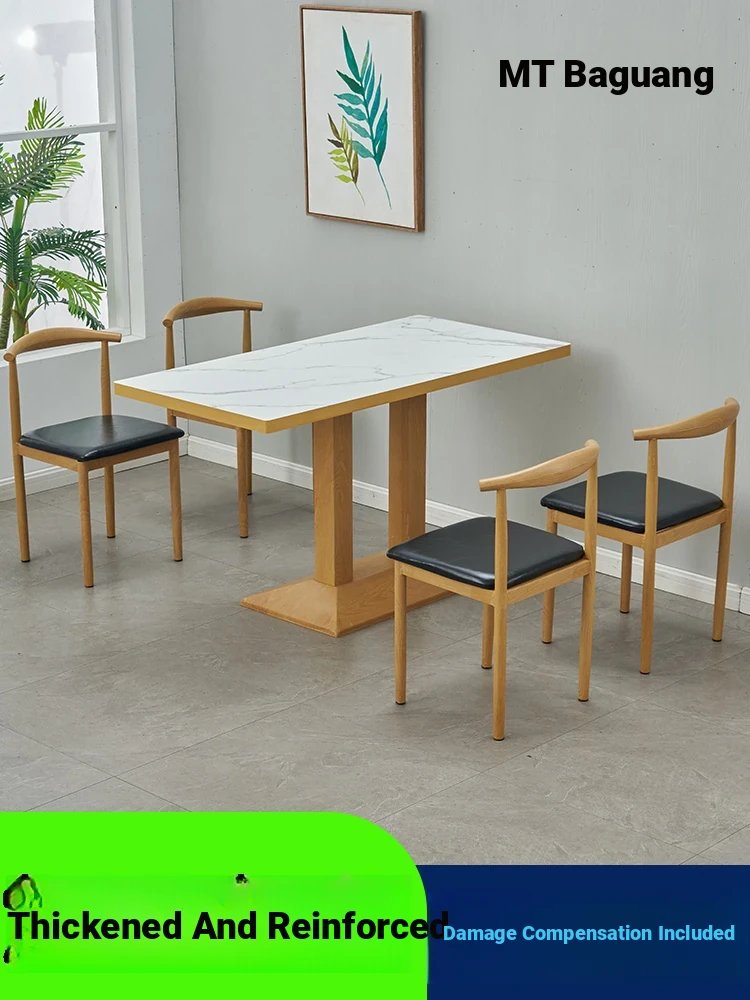 Modern Minimalist Restaurant Table and Chair Set - Commercial Use, Faux Wood Finish, Iron Frame, Leisure Dining Table with Horn Chairs for an Inviting Dining Experience