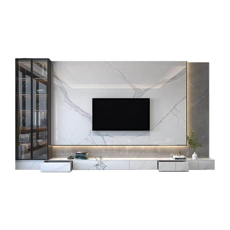 Modern Minimalist Marble TV Wall with Floating TV Cabinet - Trendy Ceramic Tile Design for a Luxurious Living Room Experience