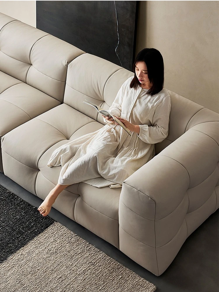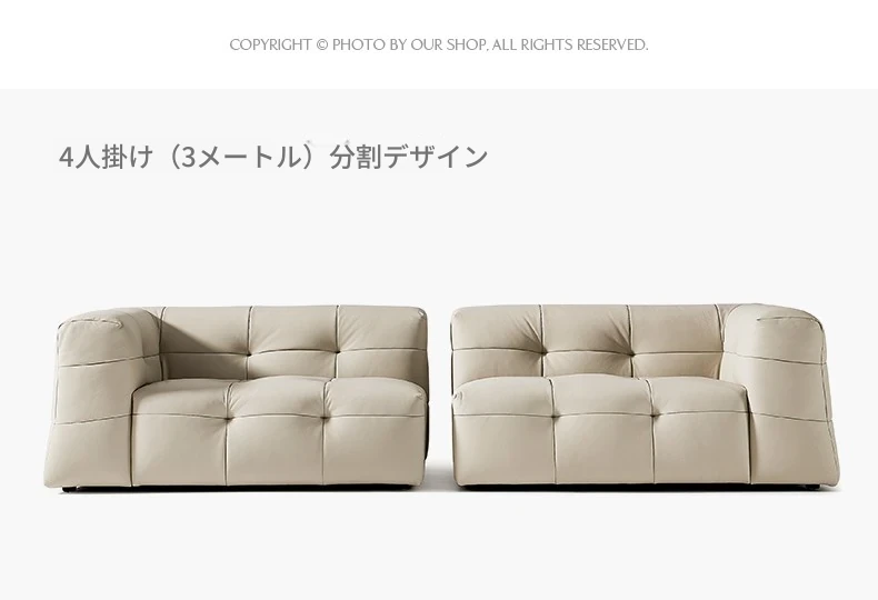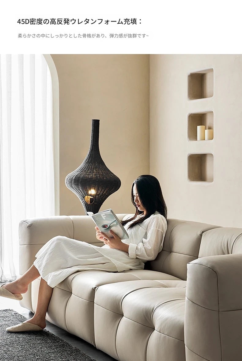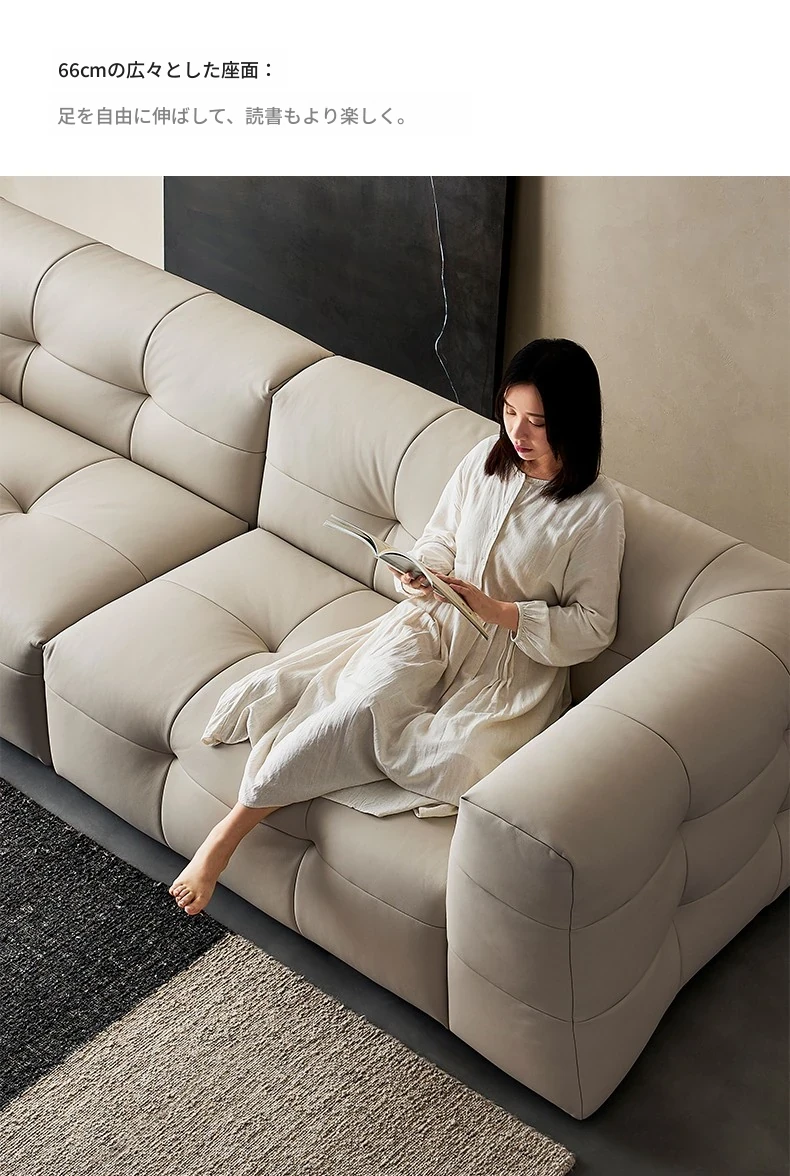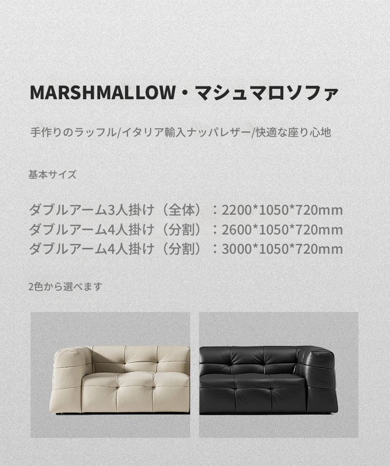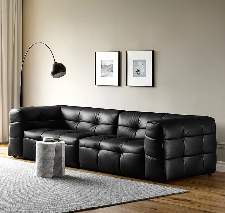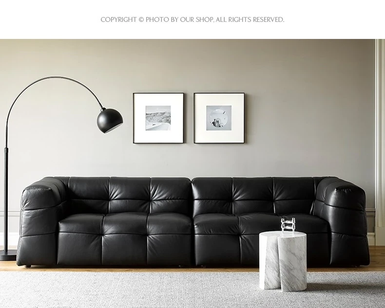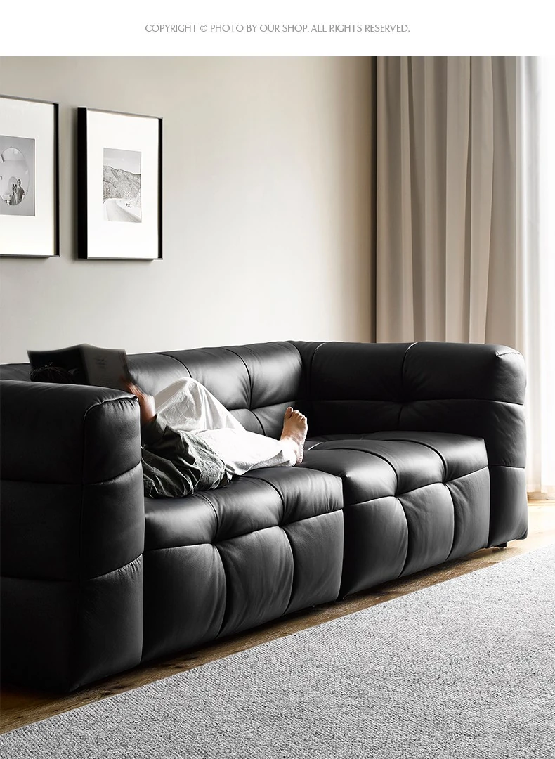 イタリアン本革トップグレインカウレザー使用!ふわふわマシュマロ豆腐ブロックデザインの直線的な侘び寂び風レトロソファ。小さなリビングにぴったりなブラックソファで、心地よい空間を演出します。