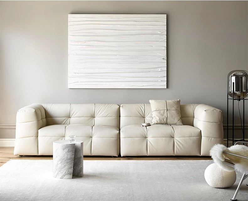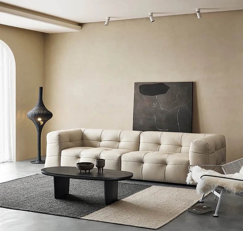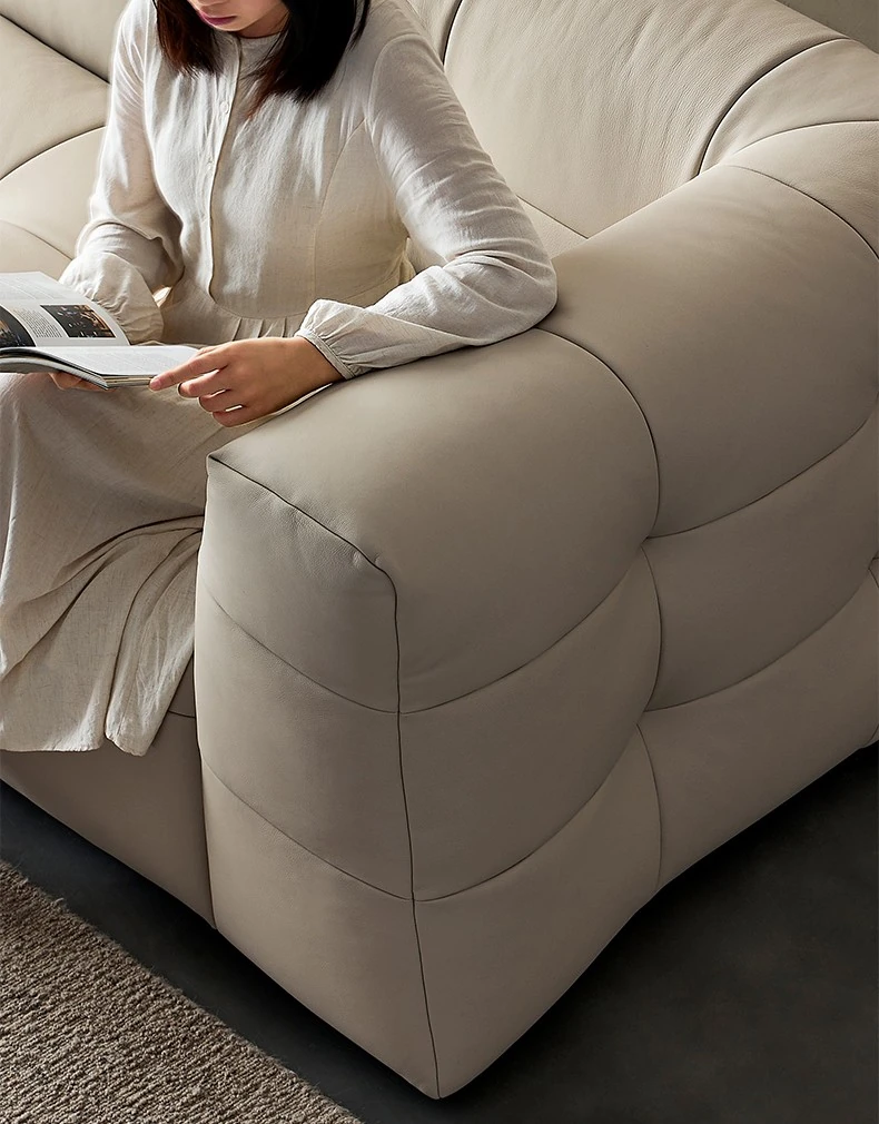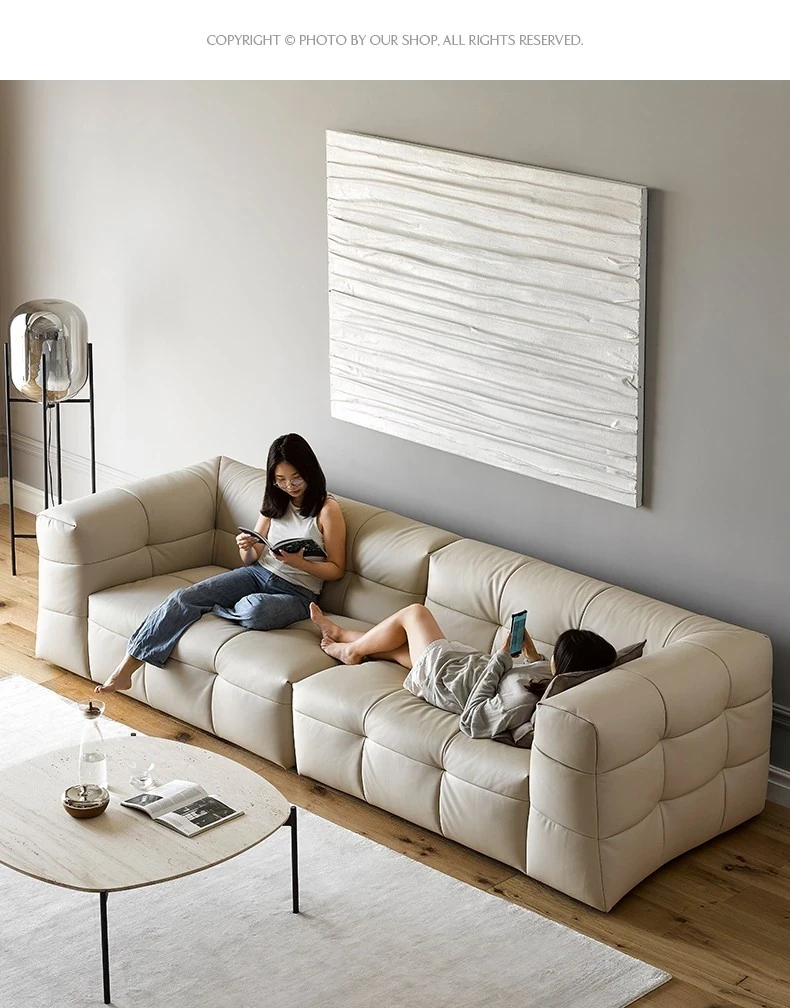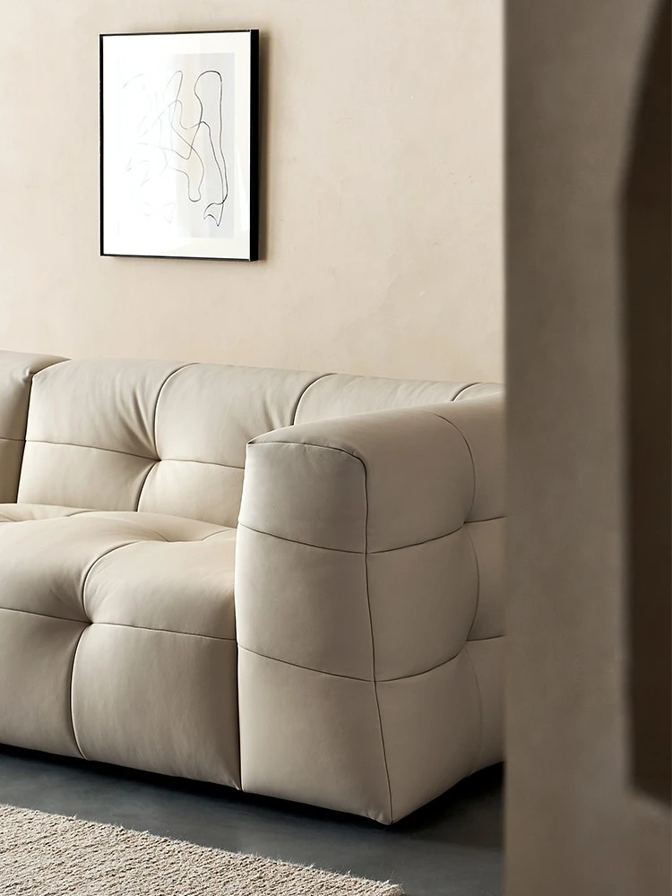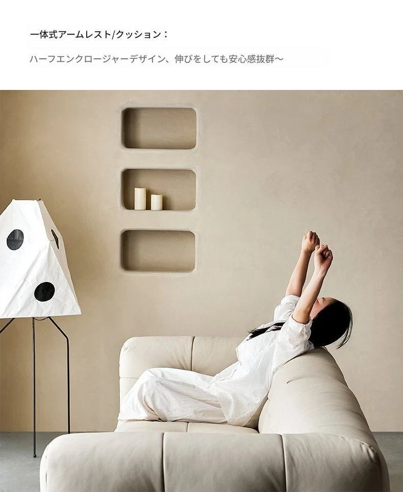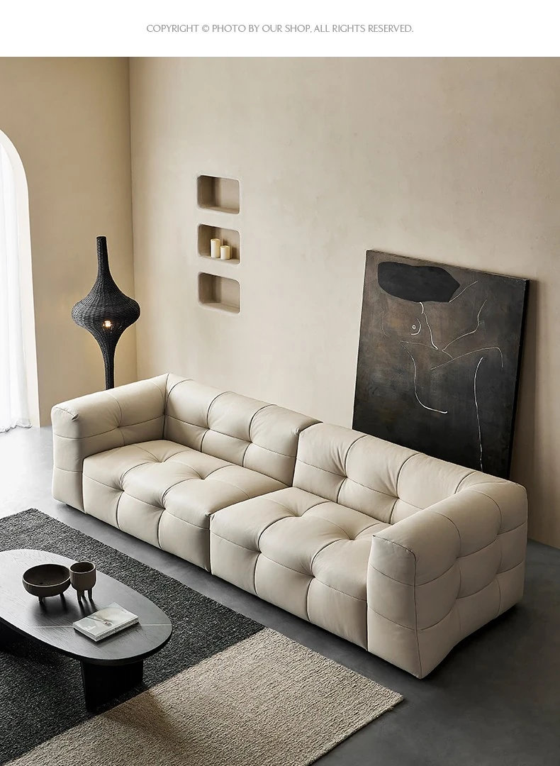 イタリアン本革トップグレインカウレザー使用!ふわふわマシュマロ豆腐ブロックデザインの直線的な侘び寂び風レトロソファ。小さなリビングにぴったりなブラックソファで、心地よい空間を演出します。