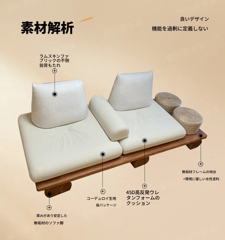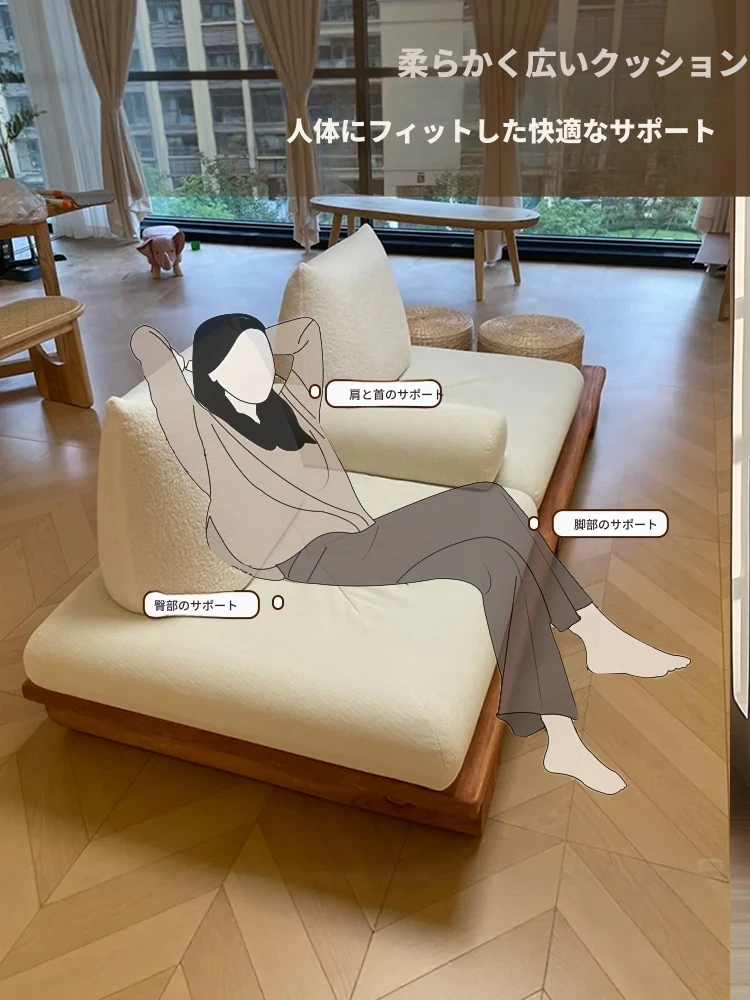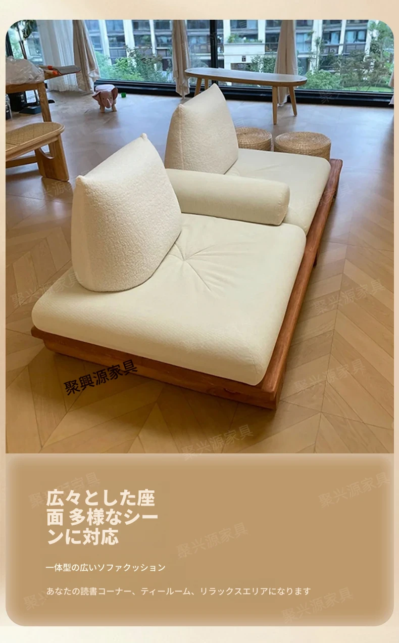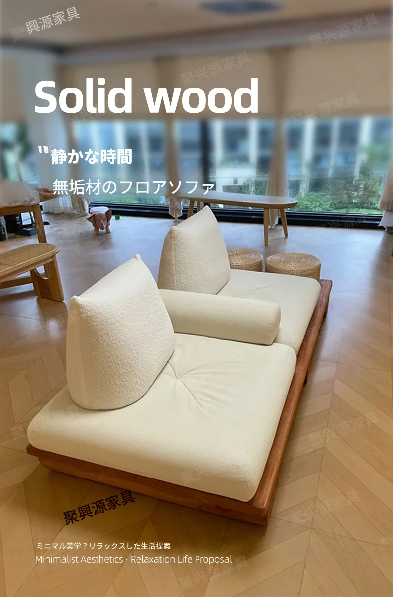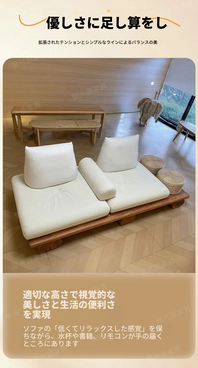 和モダンな侘寂風の本格的な無垢材ソファ|小さなリビングや畳スペースに最適!民宿やホテルの休憩エリアにもぴったり。おしゃれで心地よい空間を演出します。