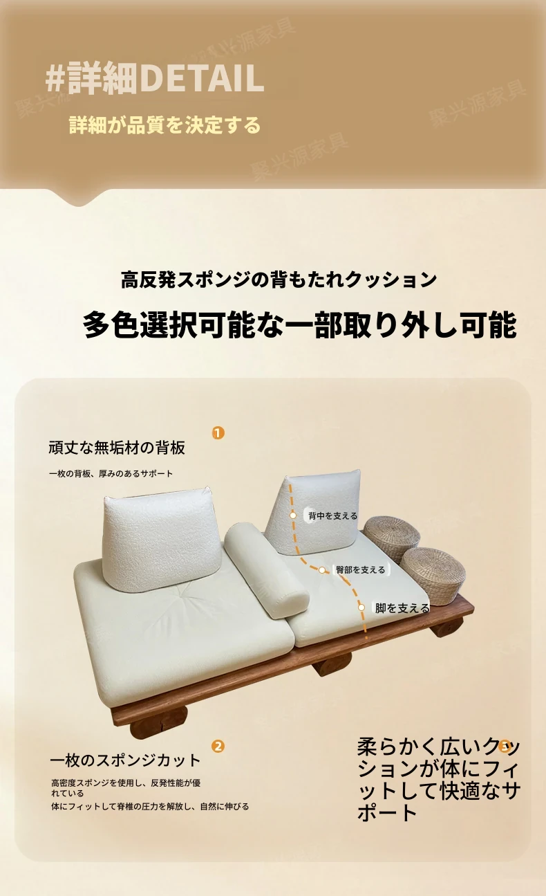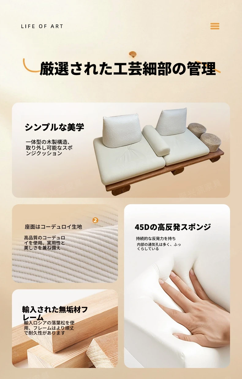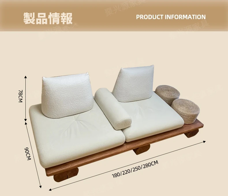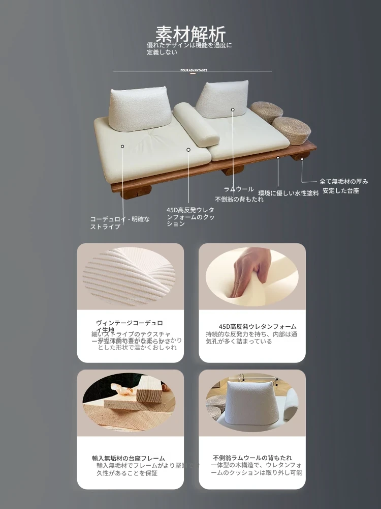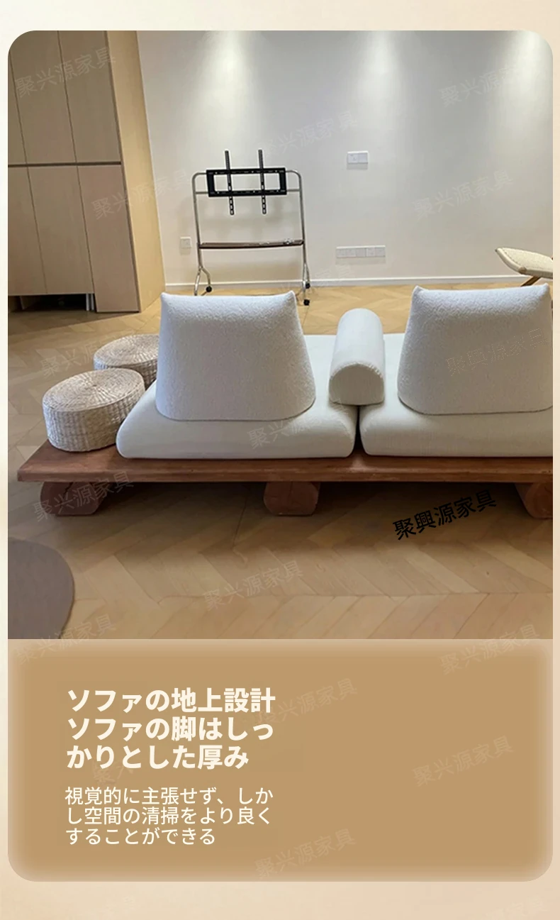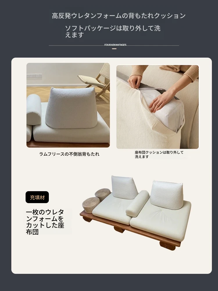和モダンな侘寂風の本格的な無垢材ソファ|小さなリビングや畳スペースに最適!民宿やホテルの休憩エリアにもぴったり。おしゃれで心地よい空間を演出します。