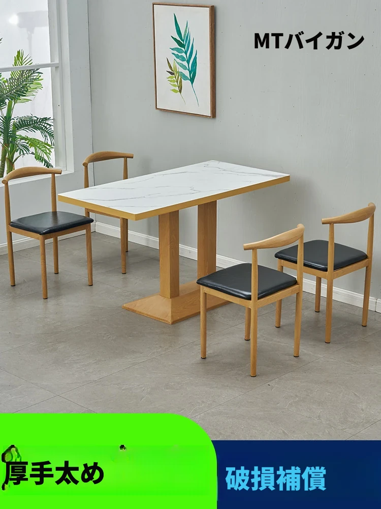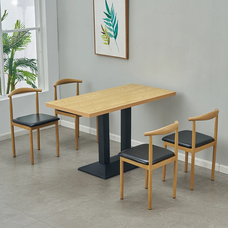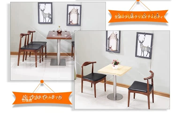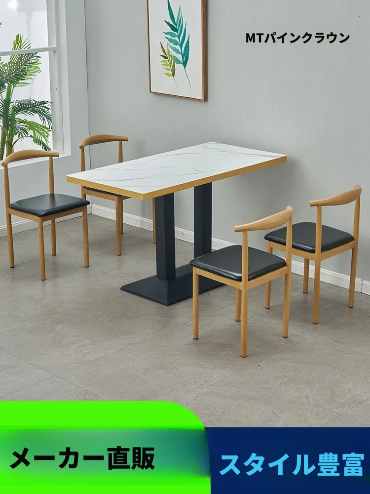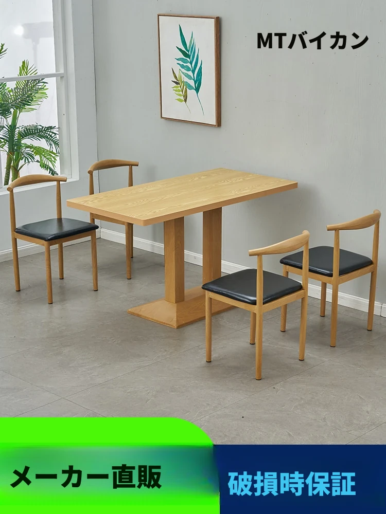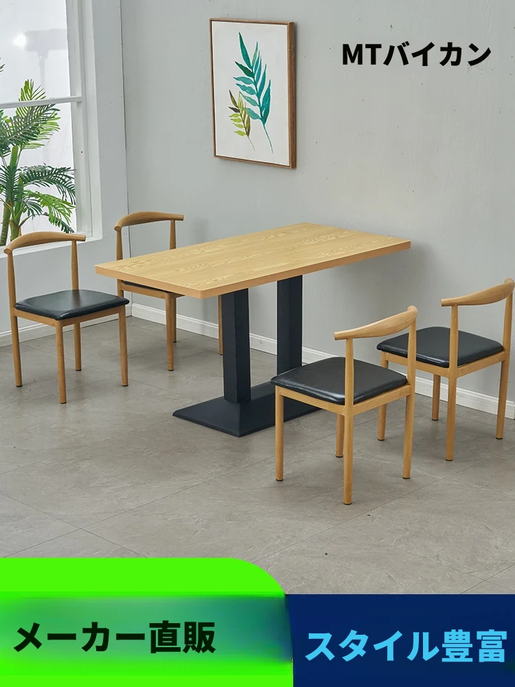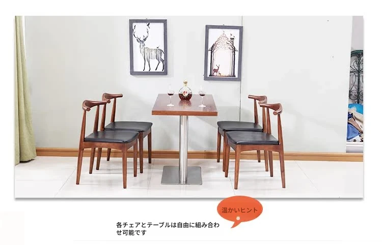 モダンでシンプルなデザインのカフェテーブルと椅子セット!背もたれ付きのアイアン製椅子とウッド調のテーブルで、商業利用にも最適。スタイリッシュな牛角椅子が、リラックスした食事のひとときを演出します。