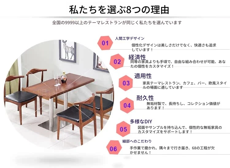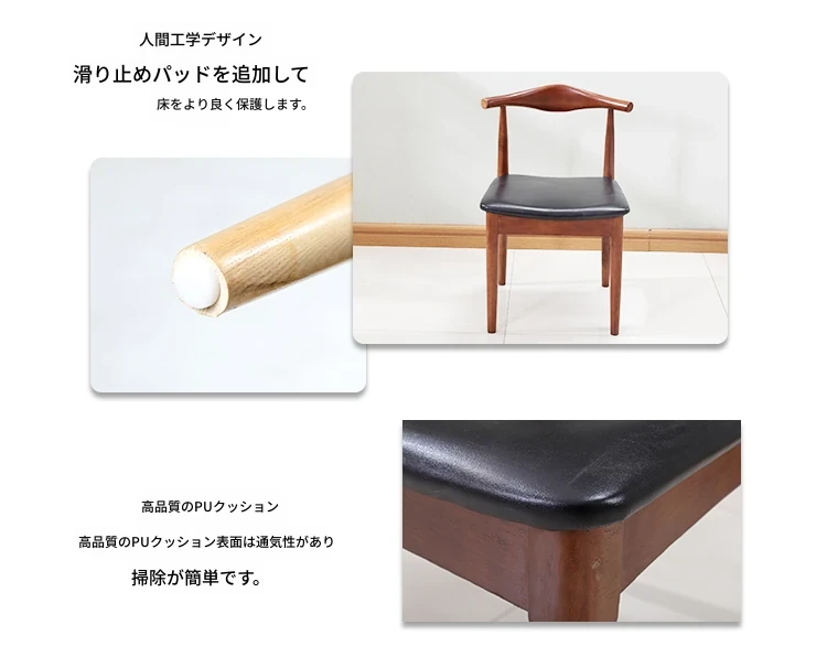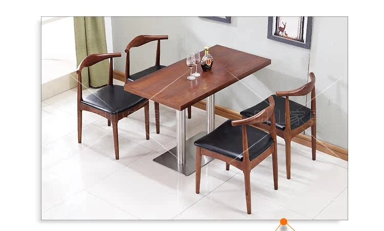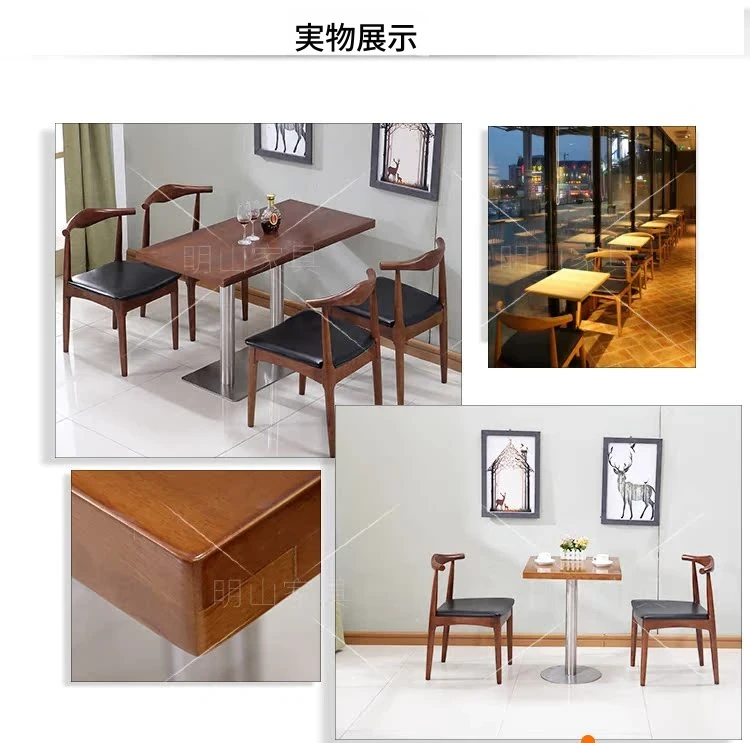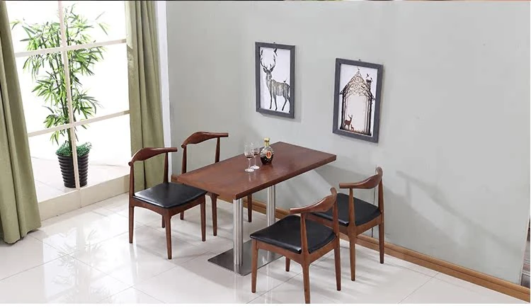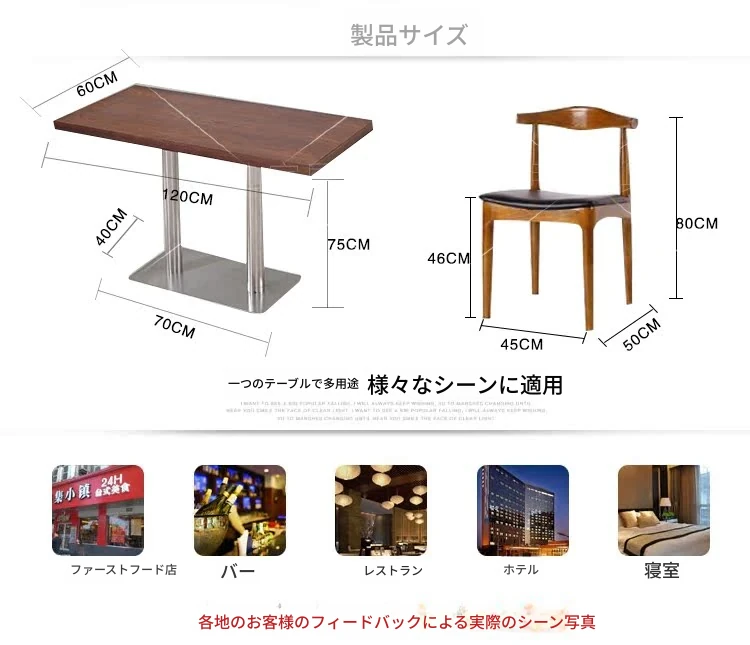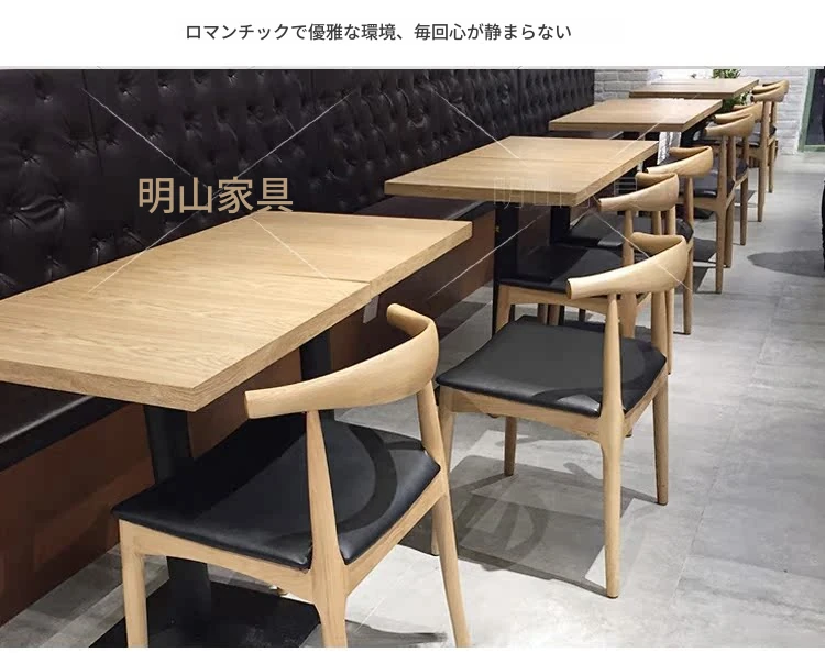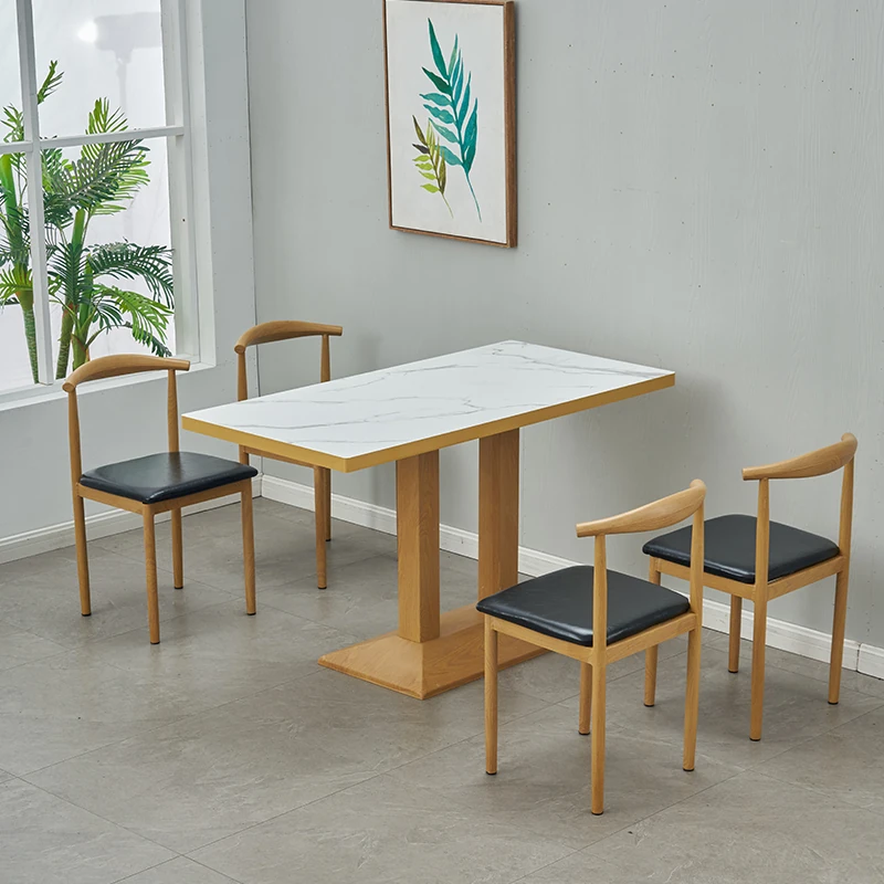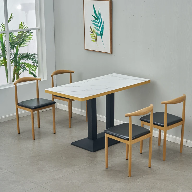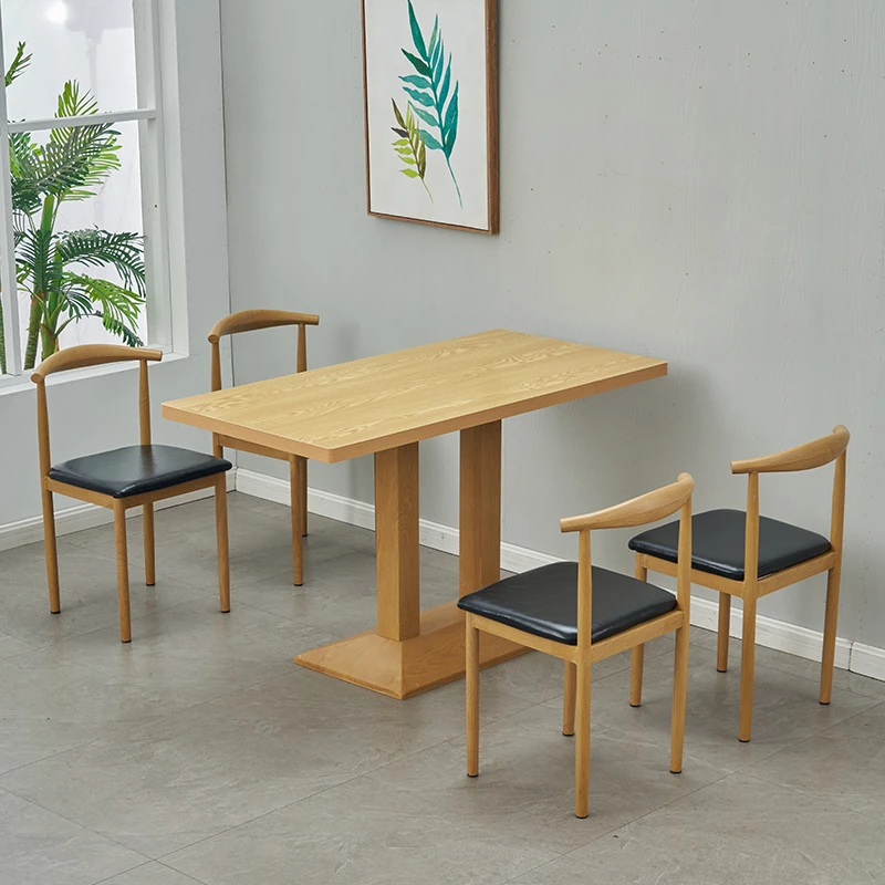 モダンでシンプルなデザインのカフェテーブルと椅子セット!背もたれ付きのアイアン製椅子とウッド調のテーブルで、商業利用にも最適。スタイリッシュな牛角椅子が、リラックスした食事のひとときを演出します。