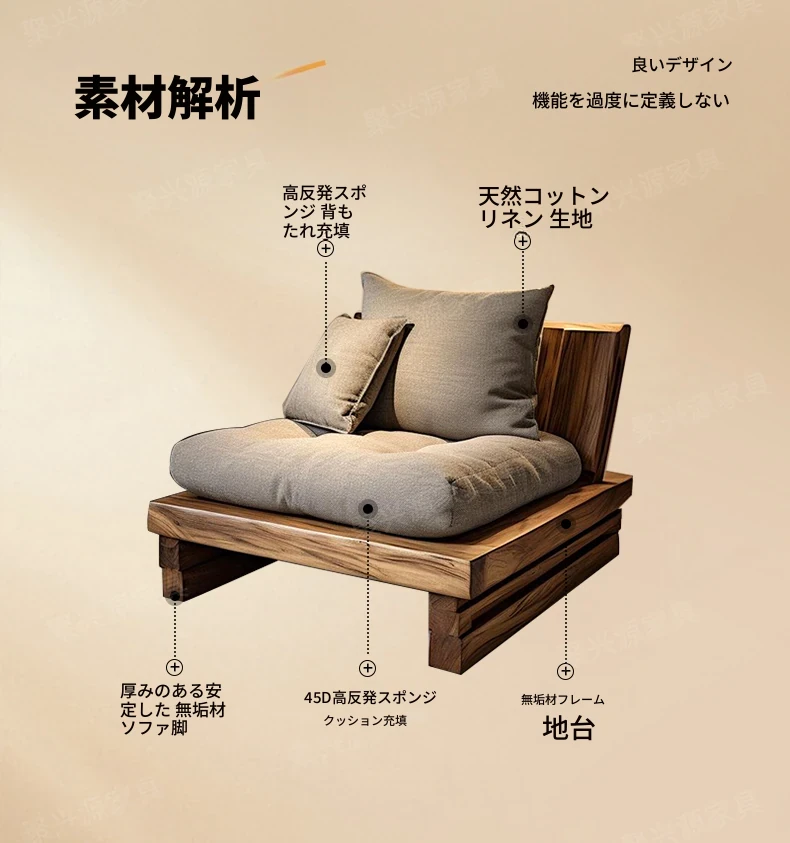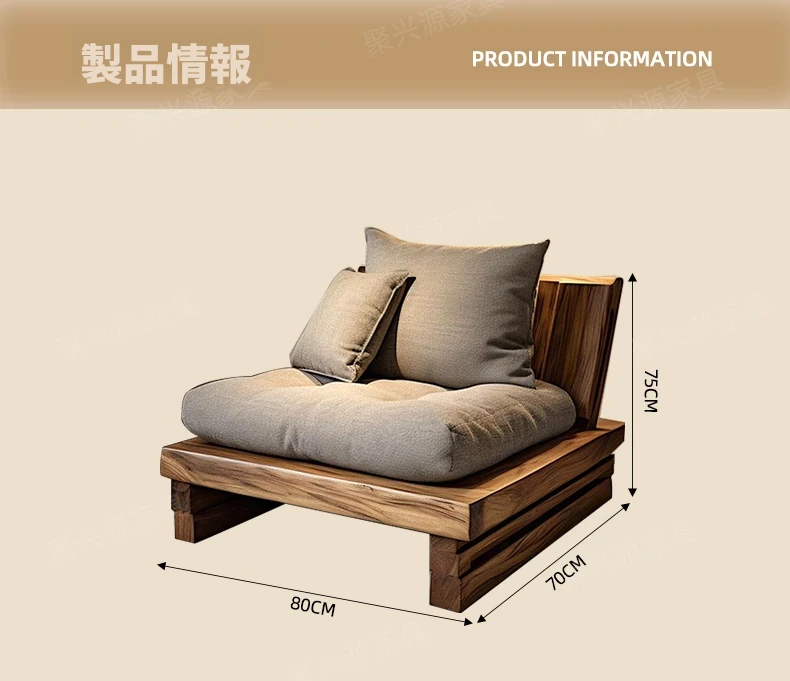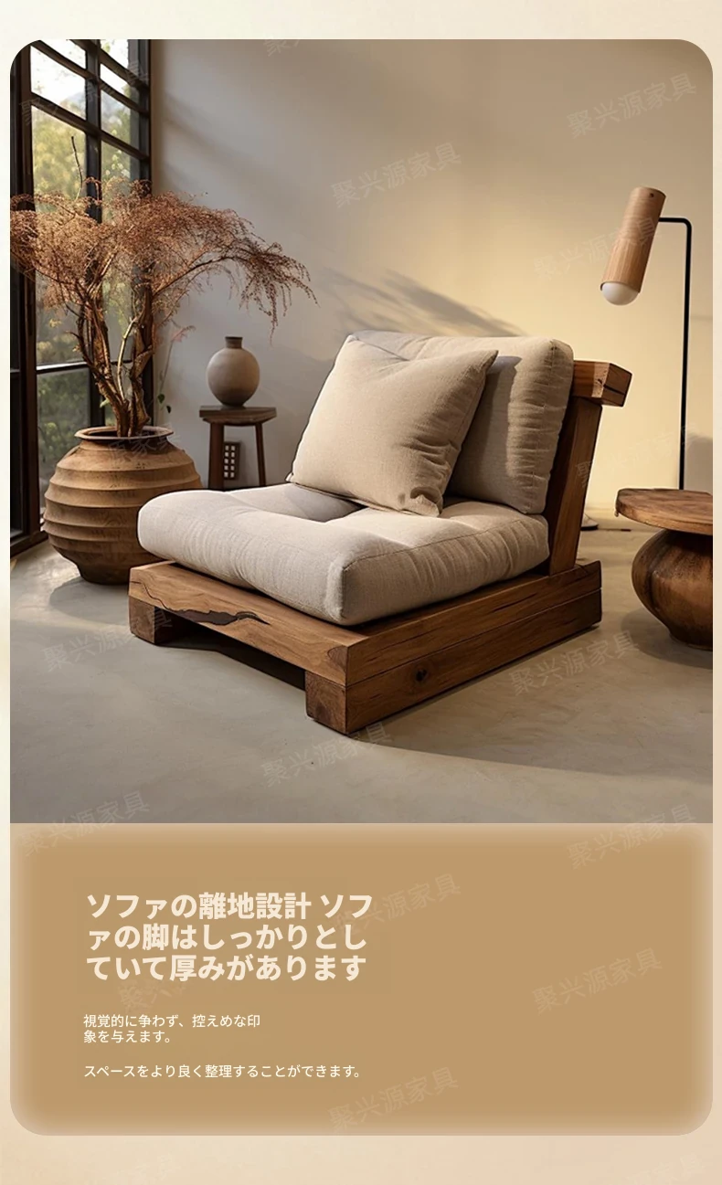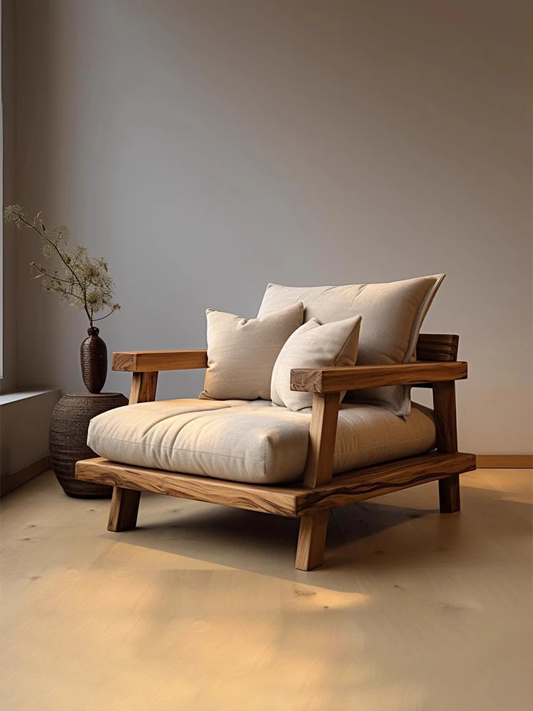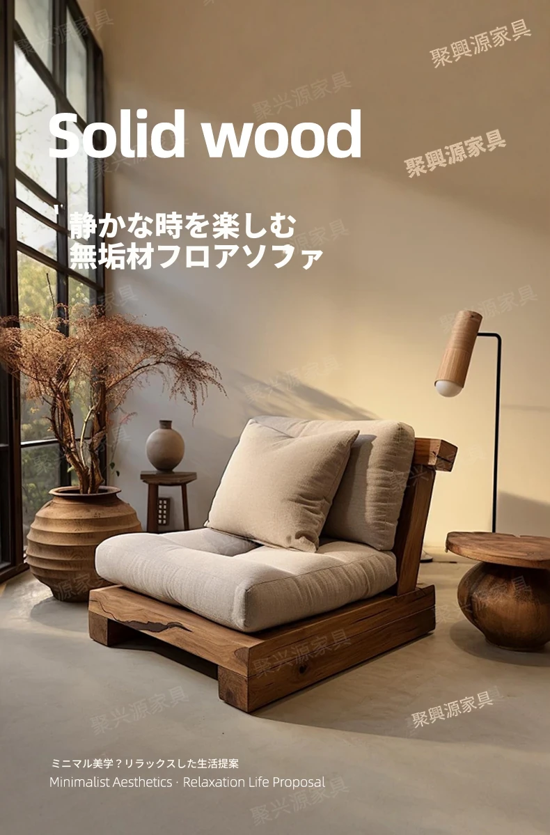 中古の侘び寂び風実木ソファ - 民宿やホテルのロビーに最適!リラックスできる原木製の一人掛け禅椅子で、心地よいひとときをお届けします。おしゃれな休息空間を演出し、ゲストに特別な体験を提供!