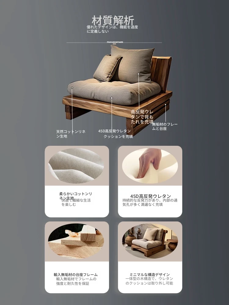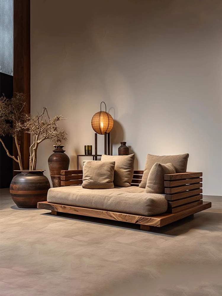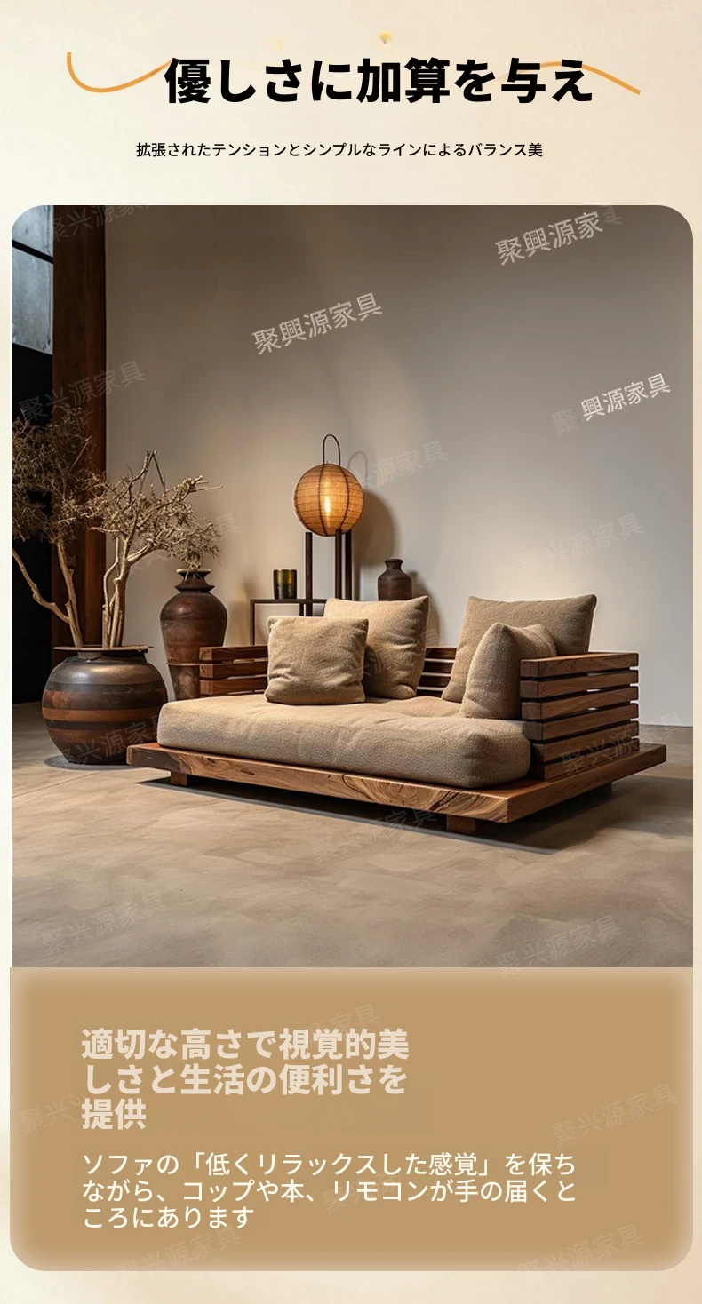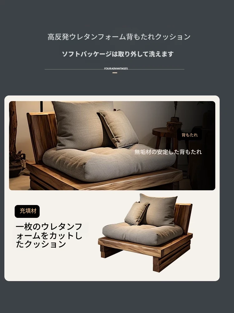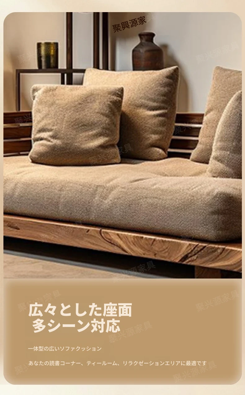 中古の侘び寂び風実木ソファ - 民宿やホテルのロビーに最適!リラックスできる原木製の一人掛け禅椅子で、心地よいひとときをお届けします。おしゃれな休息空間を演出し、ゲストに特別な体験を提供!