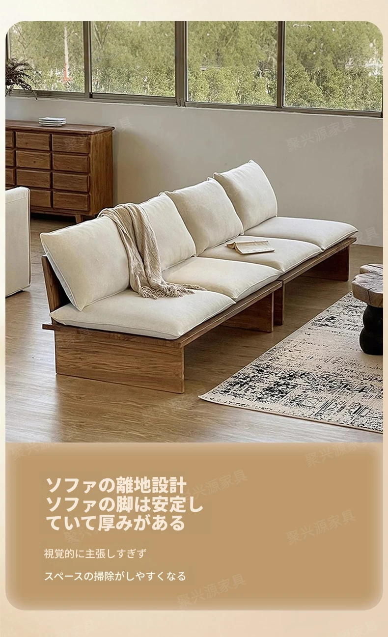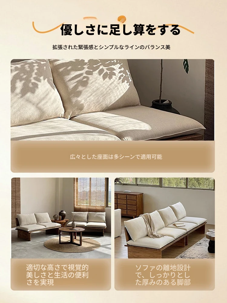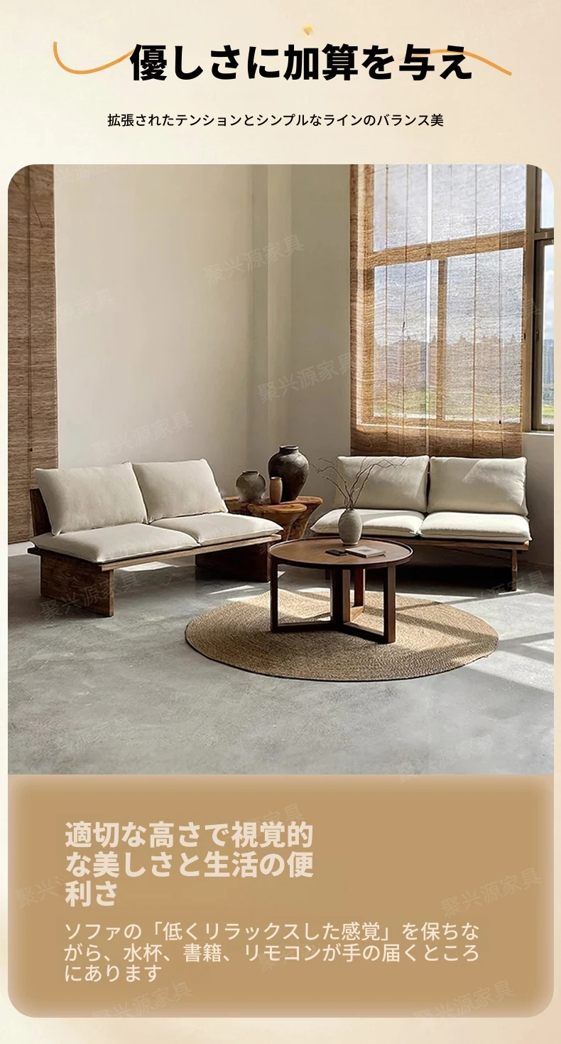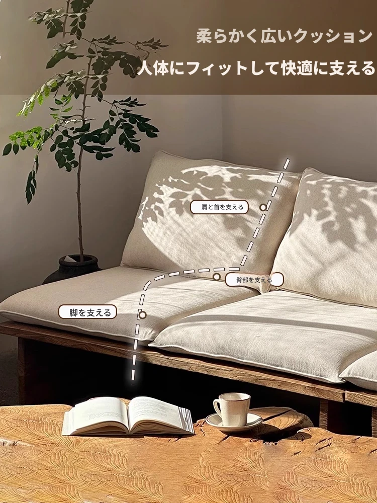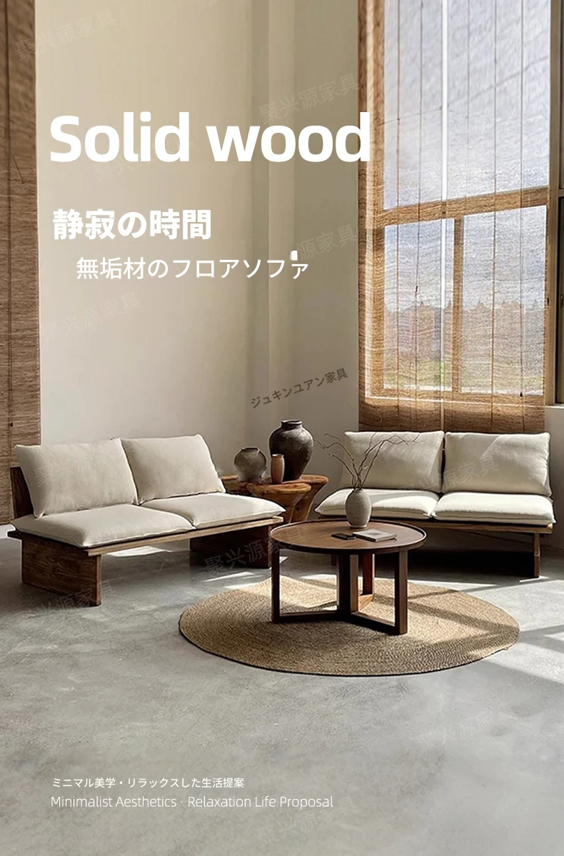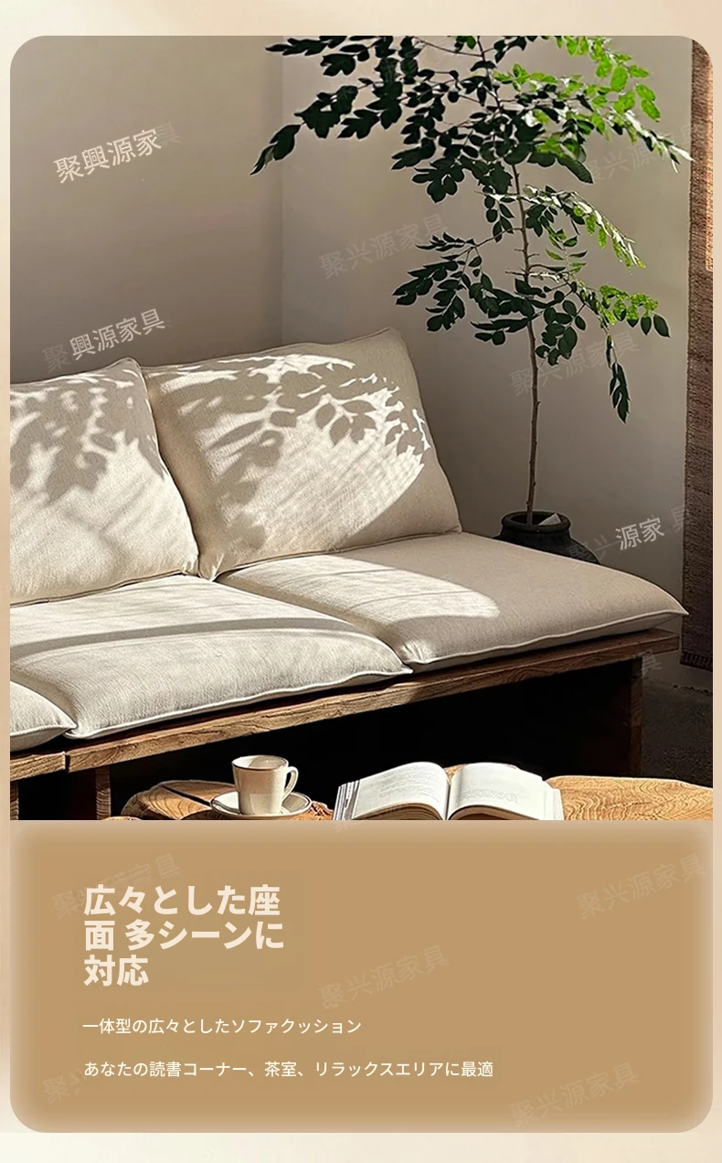 侘寂スタイルの無垢材フロアソファ - 洗えるおしゃれなレトロデザイン!カフェ、民宿、ホテルロビーに最適なカウンター席・休憩エリアにぴったり!