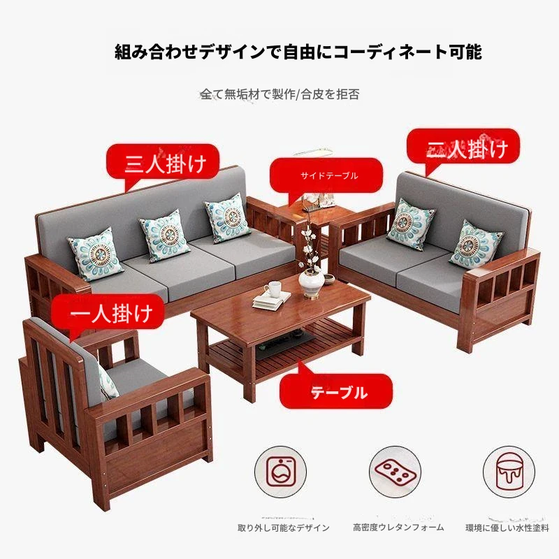 柚木色【クッション+背もたれ+抱き枕付き】、【無垢材】一人用+二人用+三人用+コーヒーテーブル+サイドテーブル