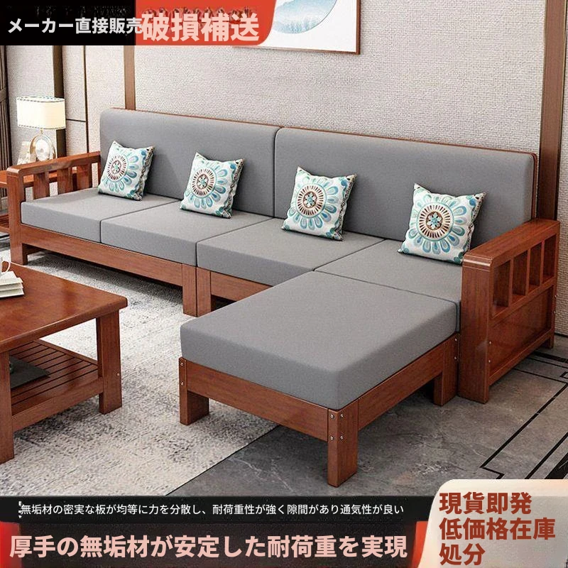 柚木色【クッション+背もたれ+抱き枕付き】、【無垢材】四人用+カウチソファ