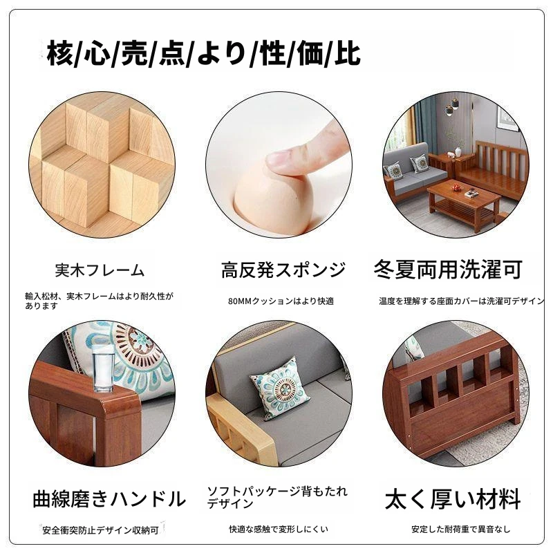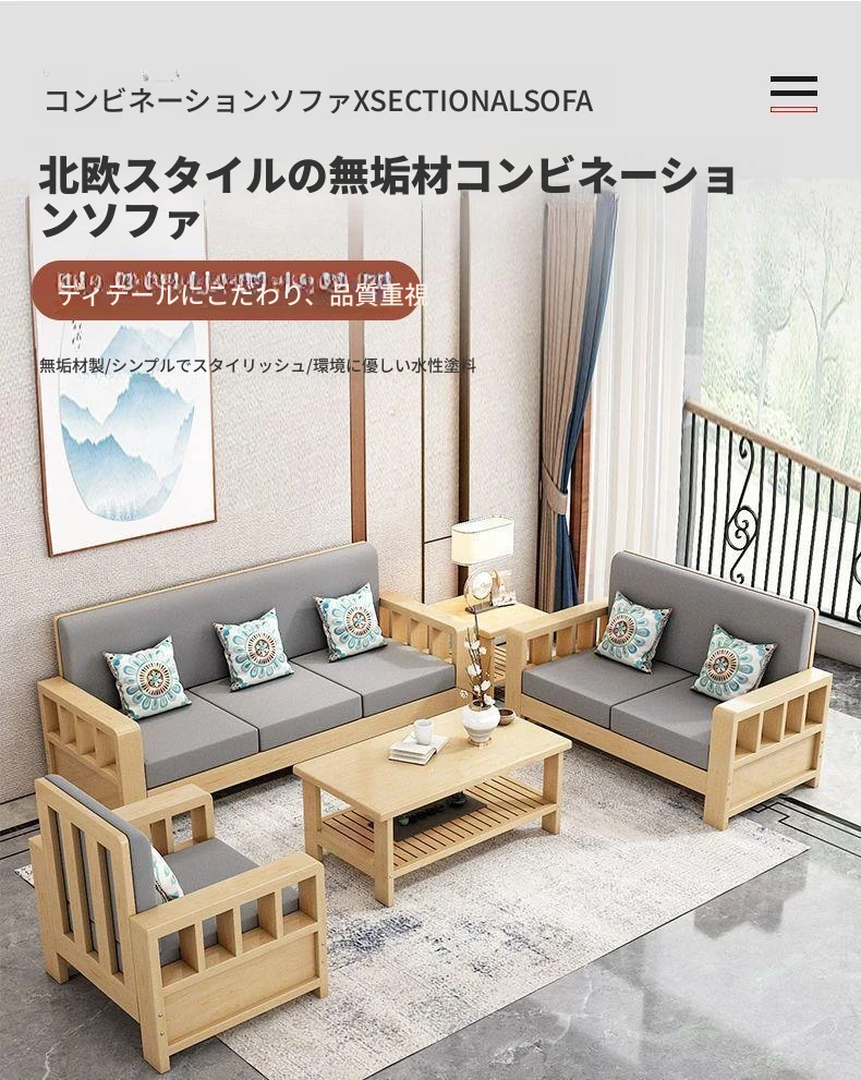 白色【クッション+背もたれ+抱き枕付き】、【無垢材】一人用+二人用+三人用+コーヒーテーブル+サイドテーブル