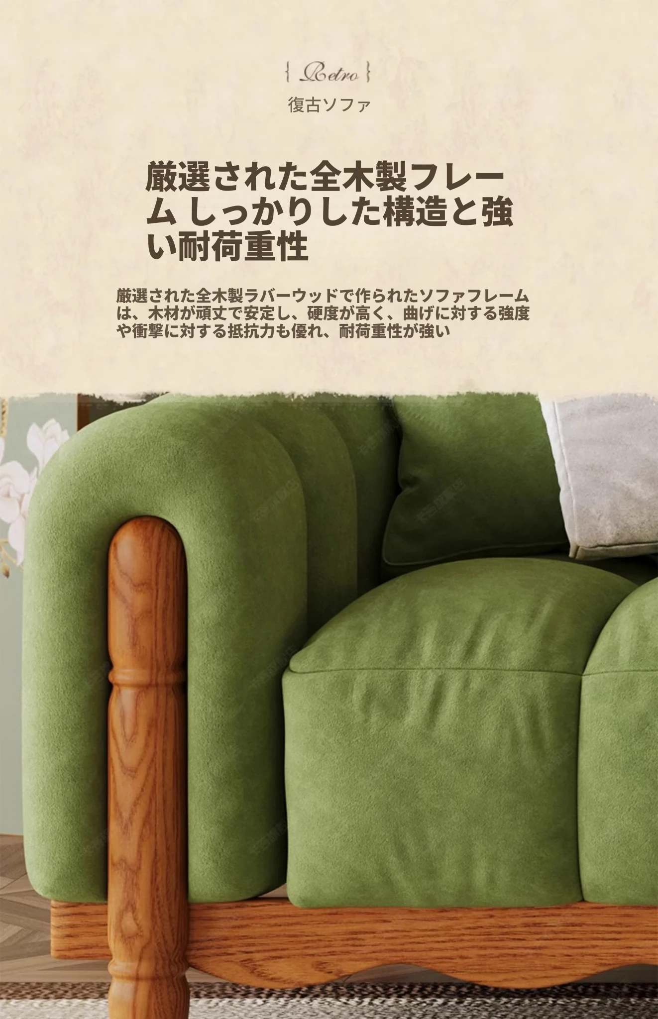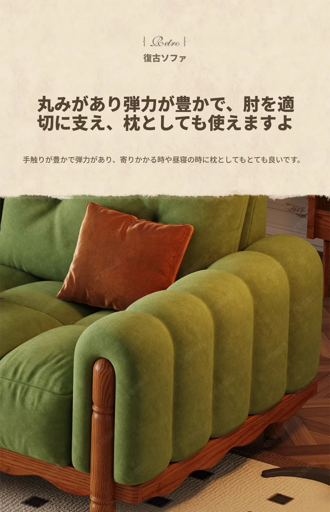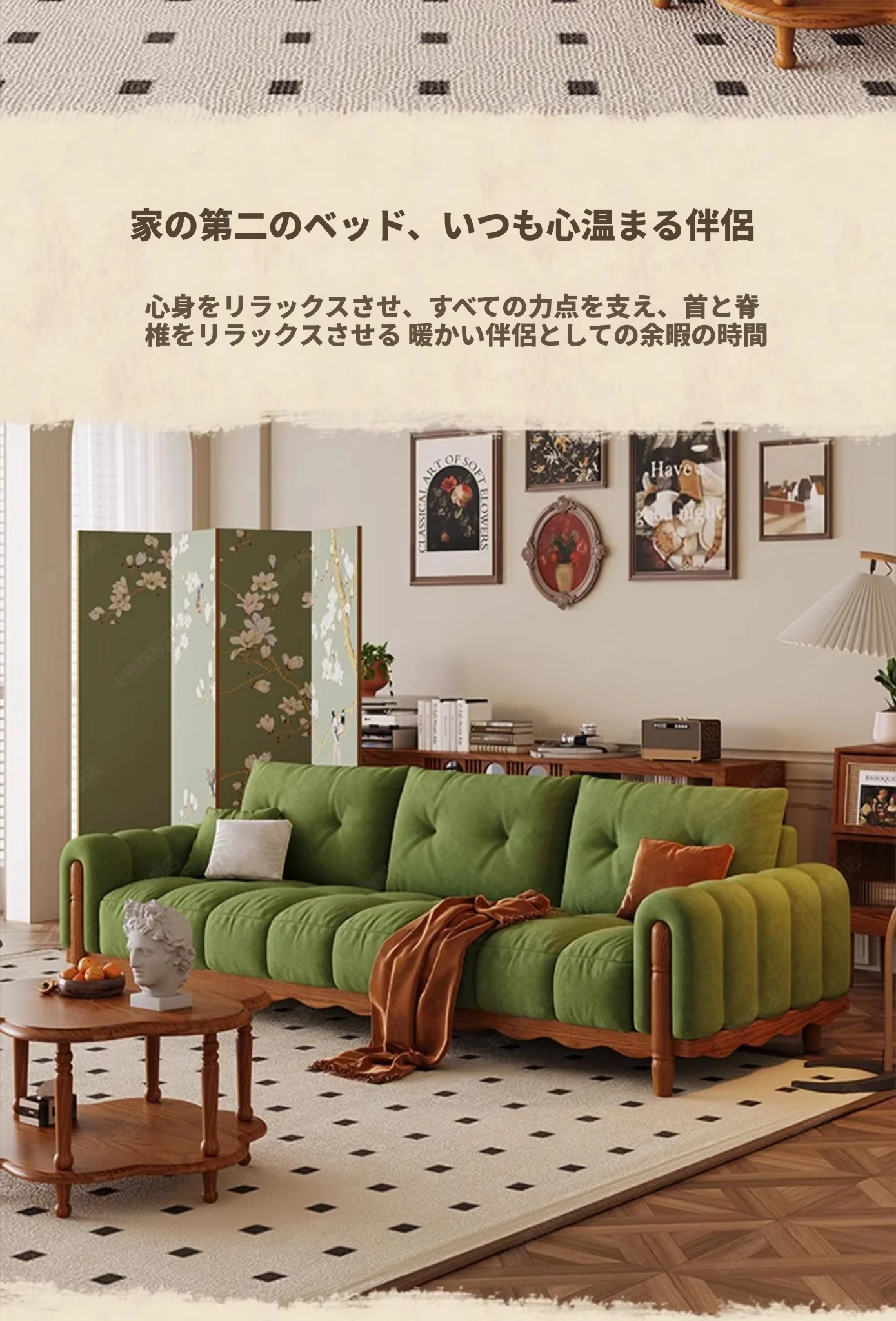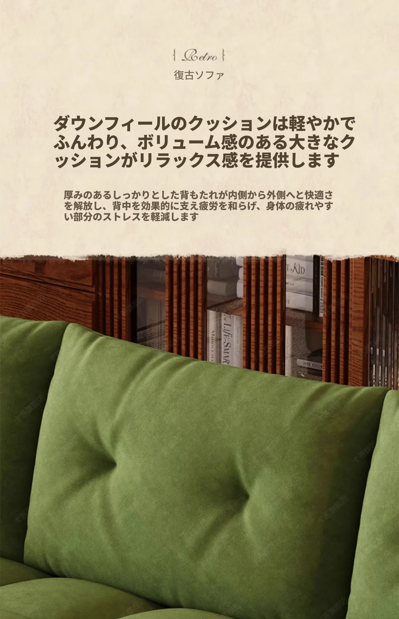 2024年新款!フレンチアンティークスタイルの無垢材ソファ - 鋼琴鍵デザインのレトロアメリカン直列生地ソファ、深いグリーンで洗練されたリビングルームにぴったり!