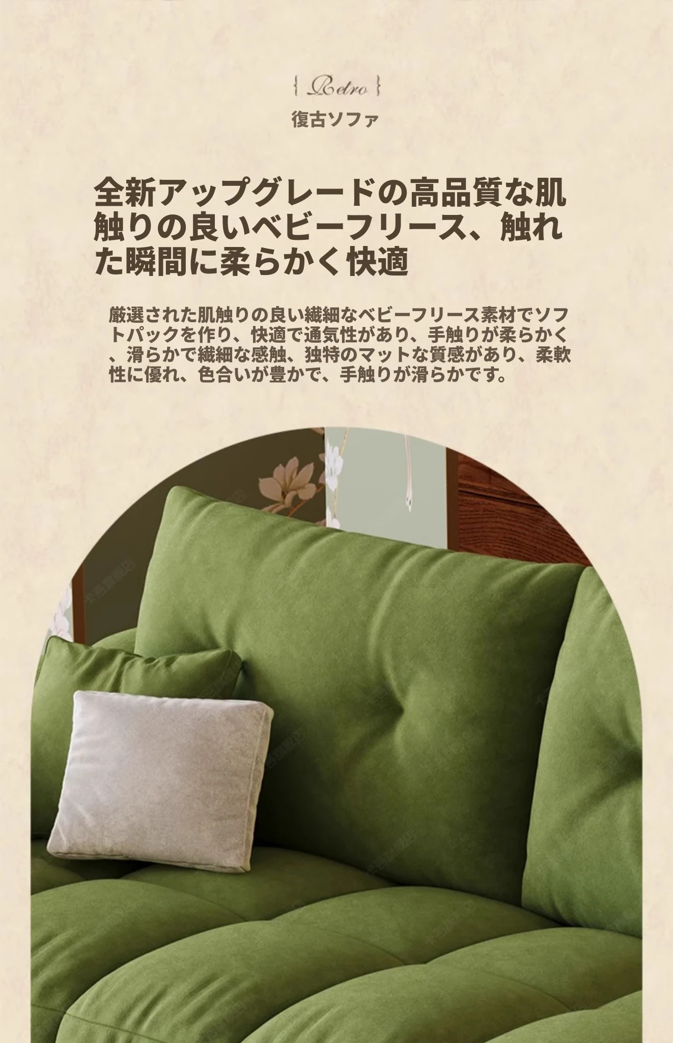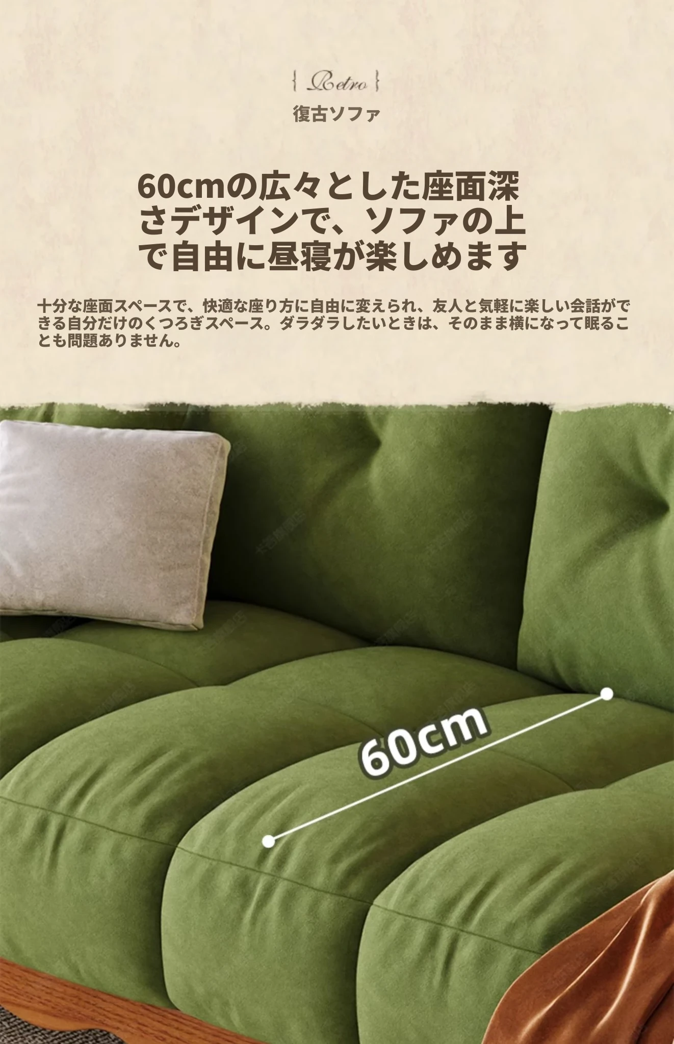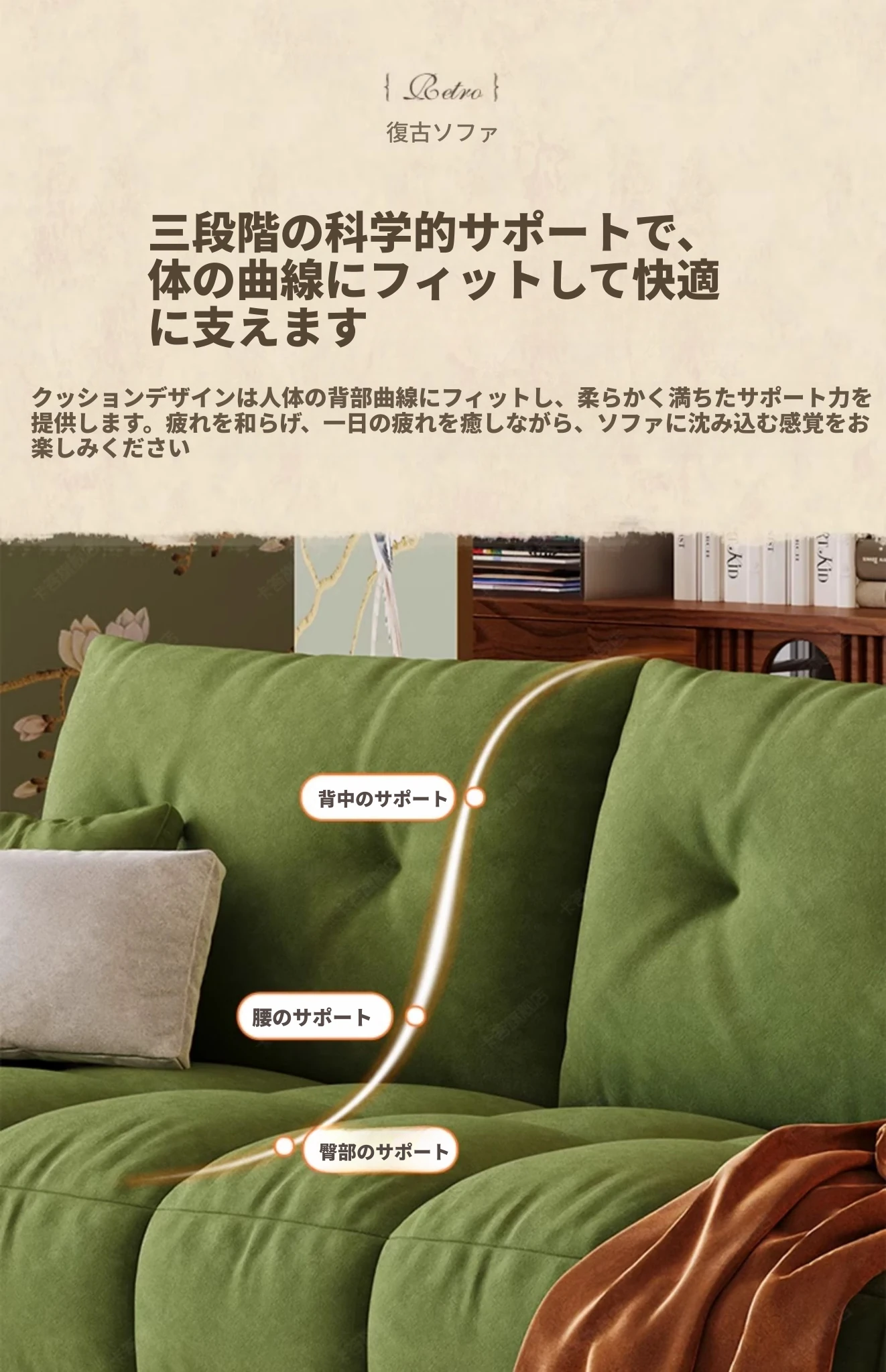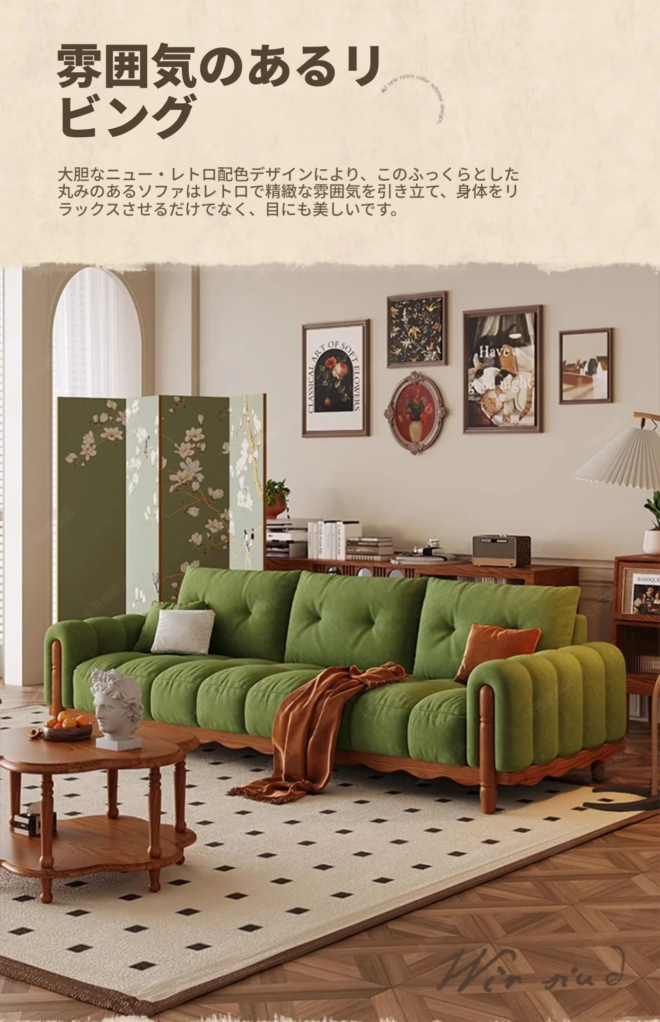 2024年新款!フレンチアンティークスタイルの無垢材ソファ - 鋼琴鍵デザインのレトロアメリカン直列生地ソファ、深いグリーンで洗練されたリビングルームにぴったり!