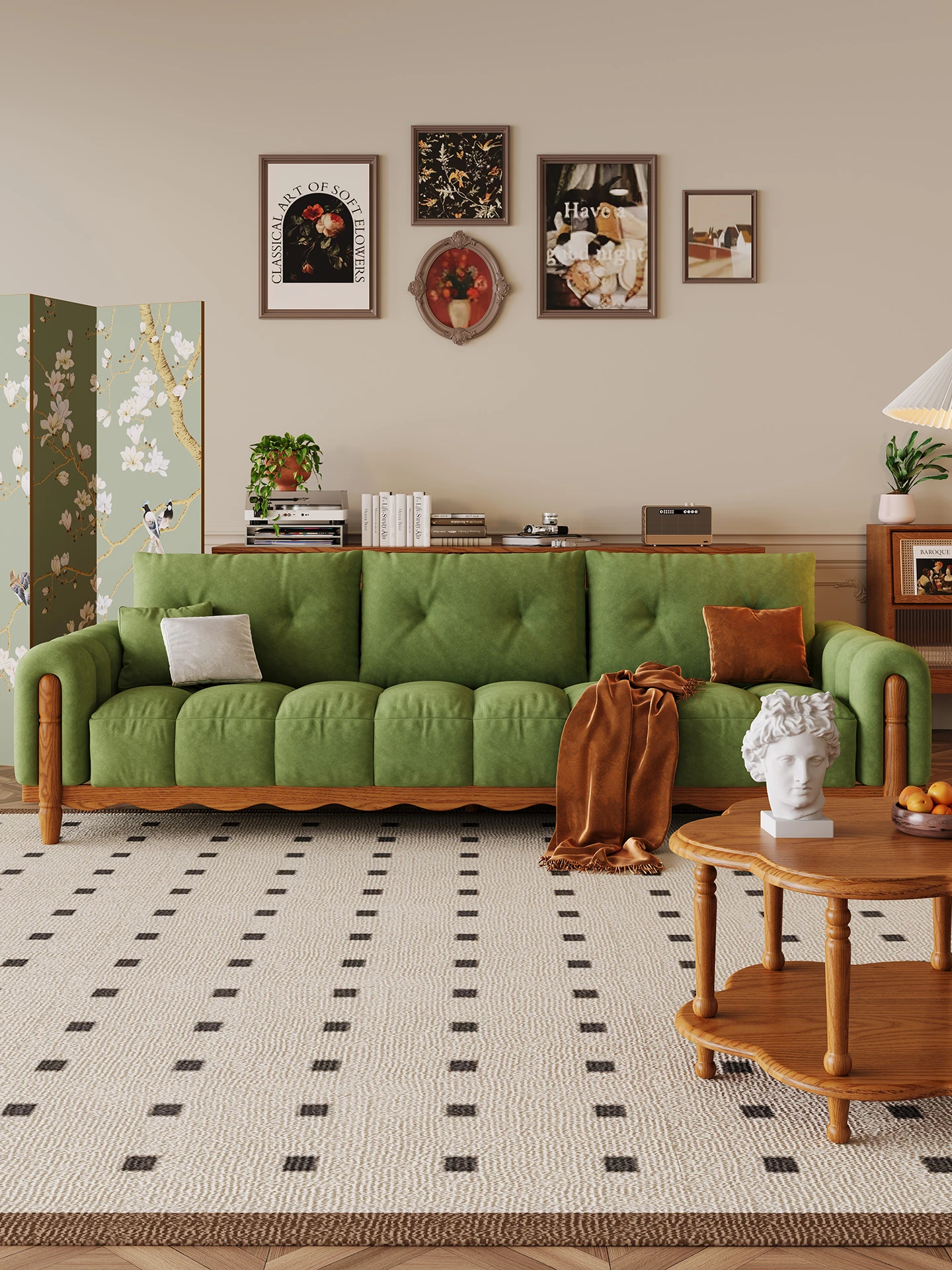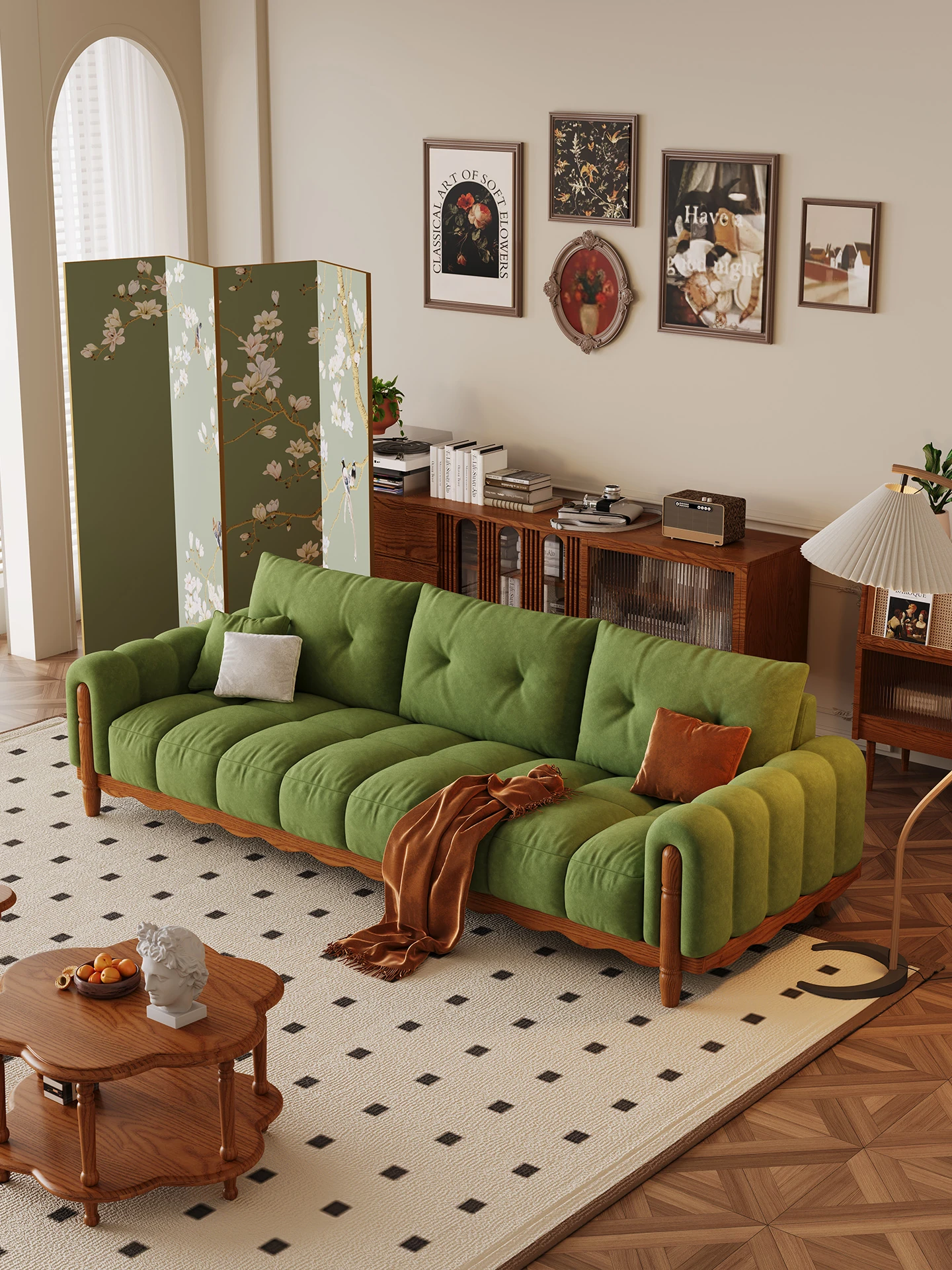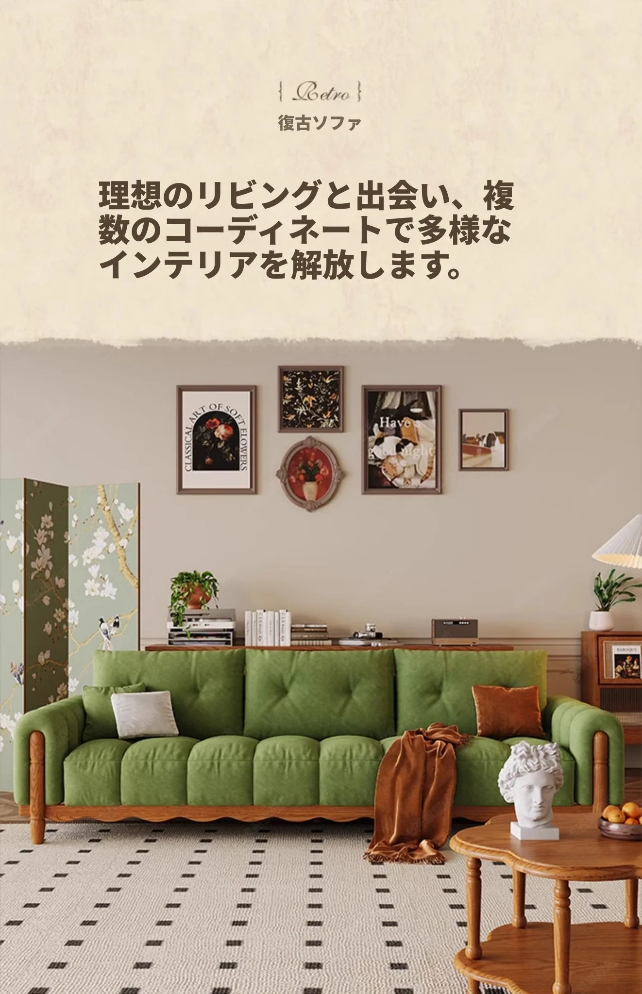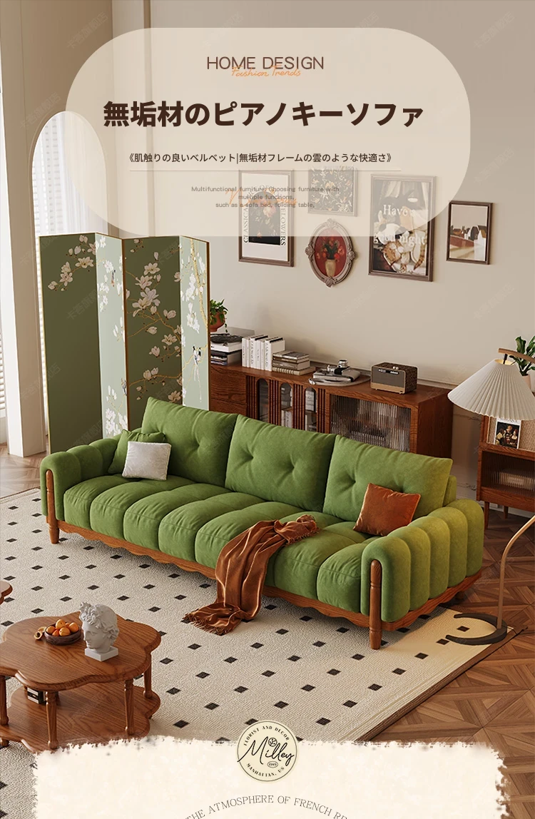 2024年新款!フレンチアンティークスタイルの無垢材ソファ - 鋼琴鍵デザインのレトロアメリカン直列生地ソファ、深いグリーンで洗練されたリビングルームにぴったり!
