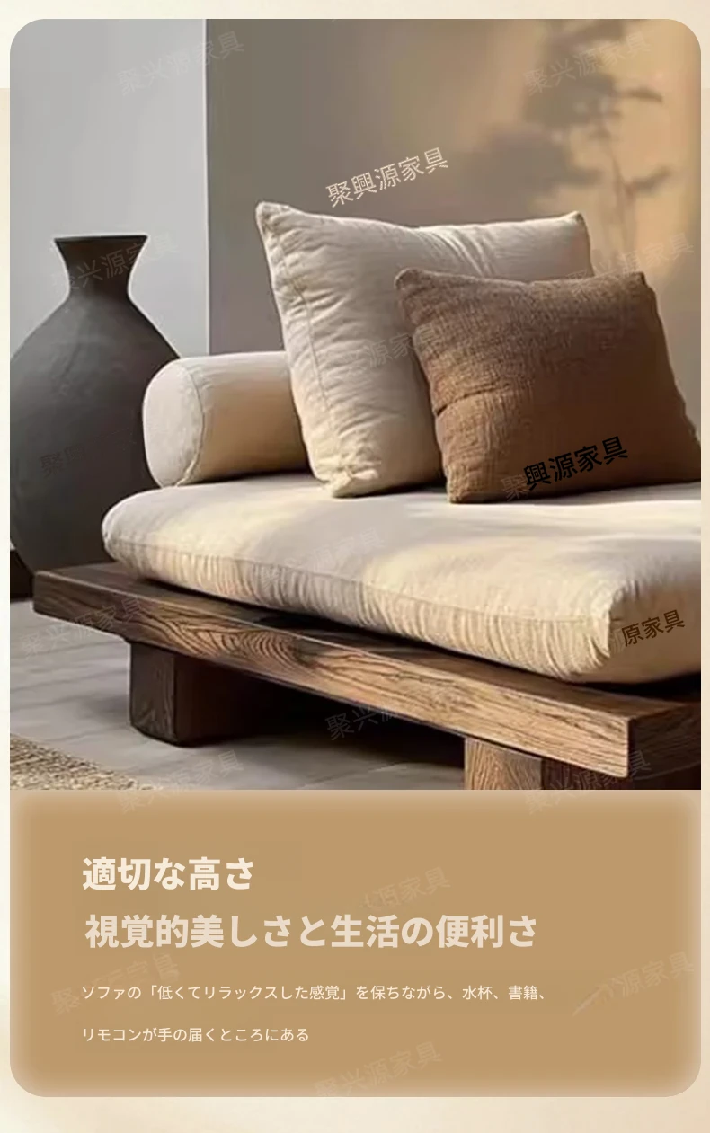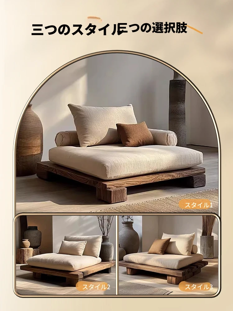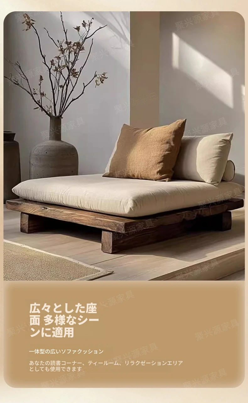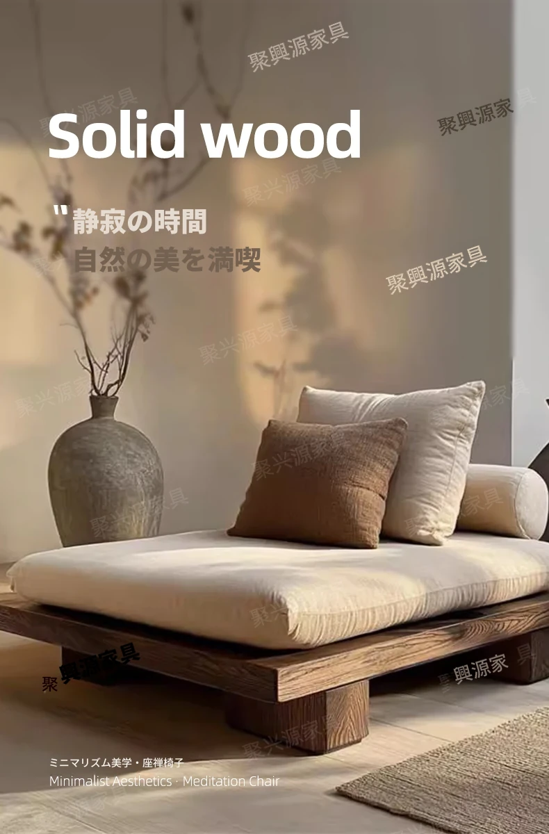侘寂の美学を感じる無垢材のフロアソファ - 座禅やリラックスに最適な一人用チェア。民宿やホテルの休憩スペースにぴったり!心地よいひとときをお届けします。