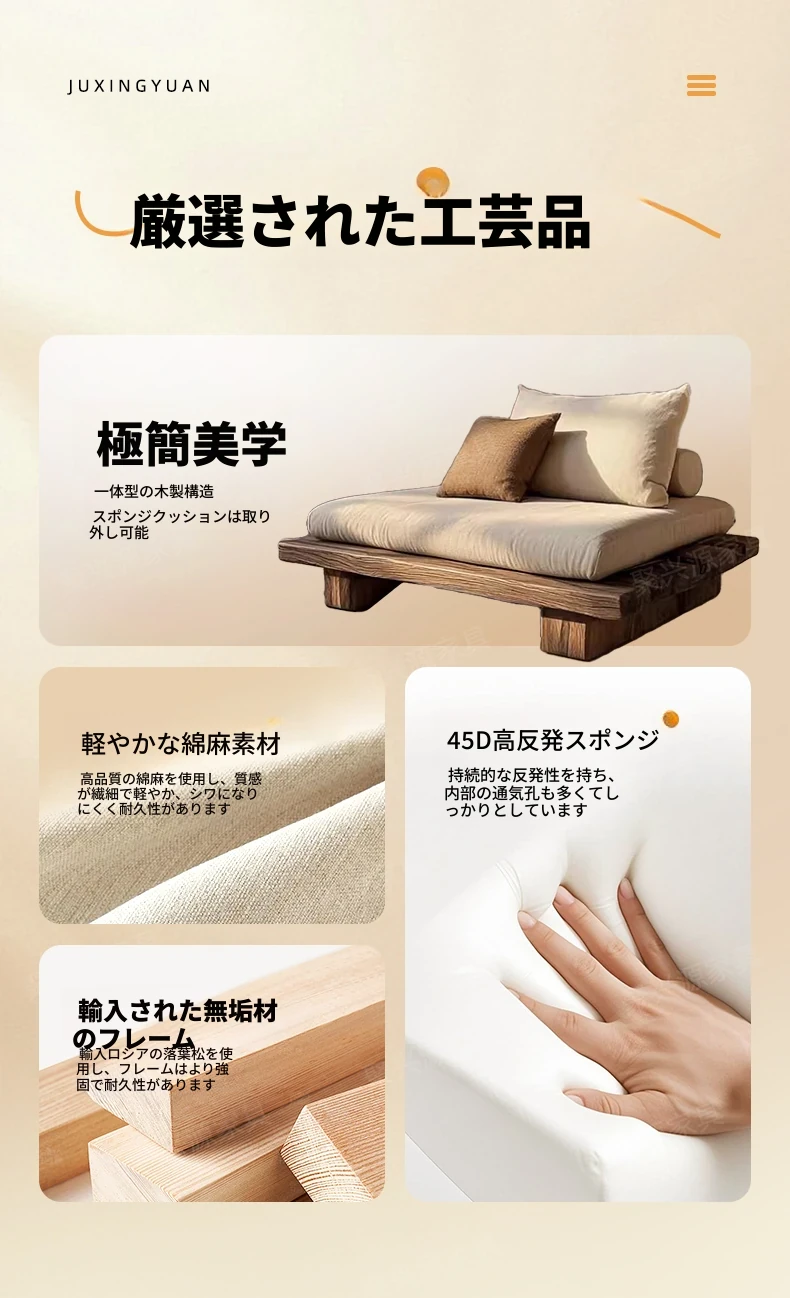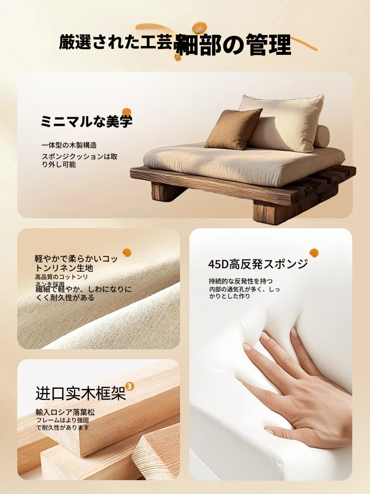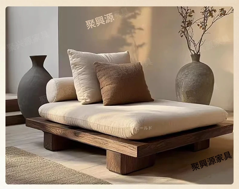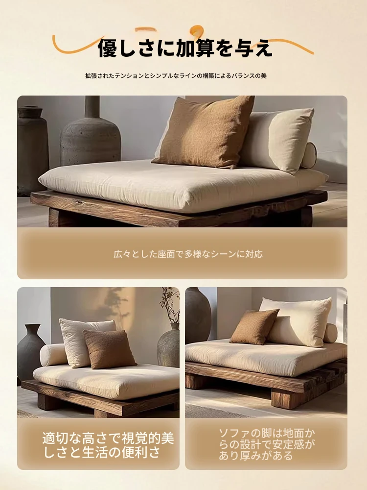 侘寂の美学を感じる無垢材のフロアソファ - 座禅やリラックスに最適な一人用チェア。民宿やホテルの休憩スペースにぴったり!心地よいひとときをお届けします。