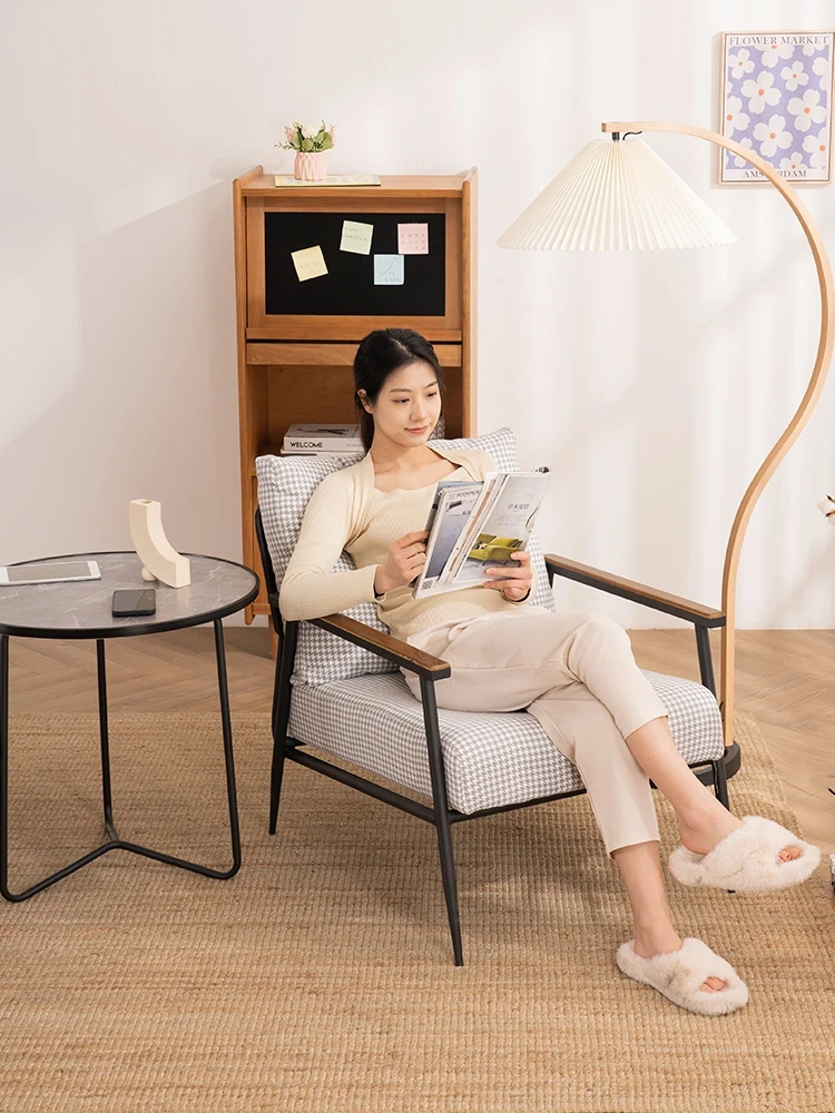 シンプルでおしゃれなアイアン製一人用ソファチェア - リビングやバルコニー、カフェにぴったりのモダンなデザイン!快適な布張りで、リラックスしたひとときを演出します。極限のミニマリズムを体験してみませんか?