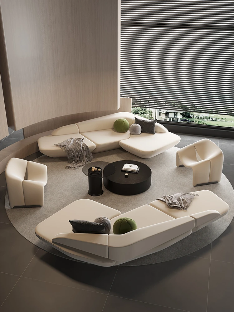 半円形デザインの異型ソファ - 小スペースにぴったり!高級感溢れるファッション店や美容院、オフィスの休憩エリアに最適。おしゃれな空間を演出し、訪れる人々を魅了します。