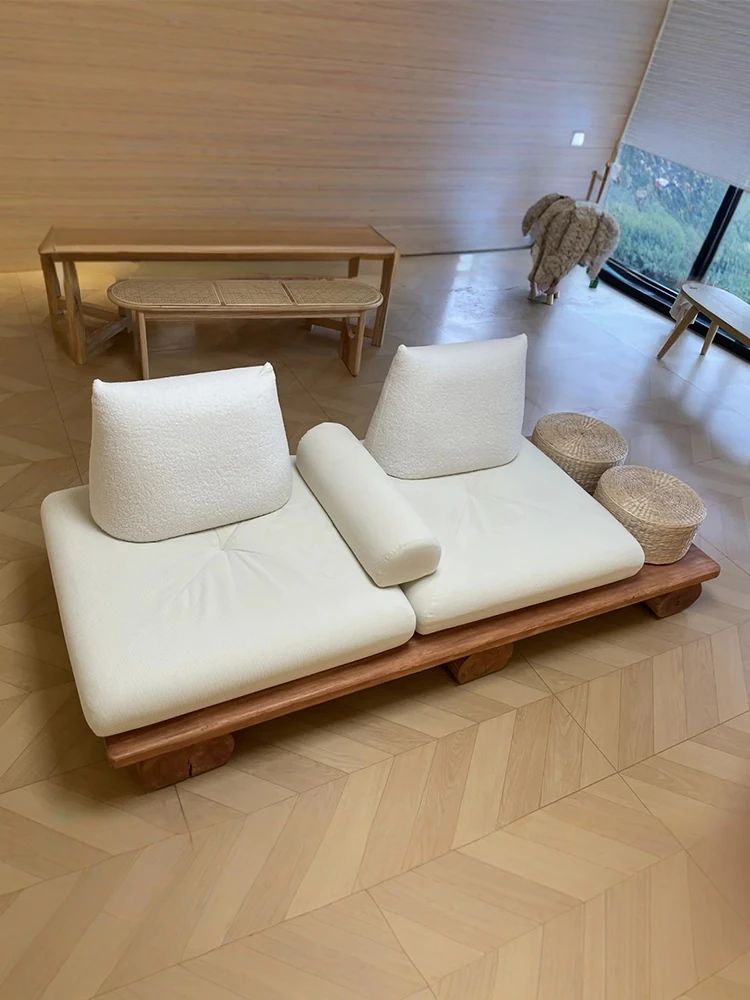 無垢材の中古侘寂風実木フロアソファ - リビングや和室にぴったり!心地よい寛ぎ空間を演出する、和の美を感じる榻榻米スタイル。民宿やカフェの休息エリアにも最適!