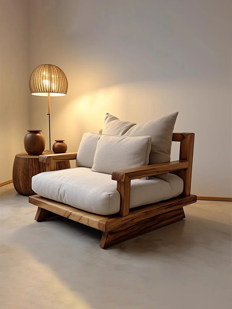 中古の侘び寂び風実木ソファ - 民宿やホテルのロビーに最適!リラックスできる原木製の一人掛け禅椅子で、心地よいひとときをお届けします。おしゃれな休息空間を演出し、ゲストに特別な体験を提供!
