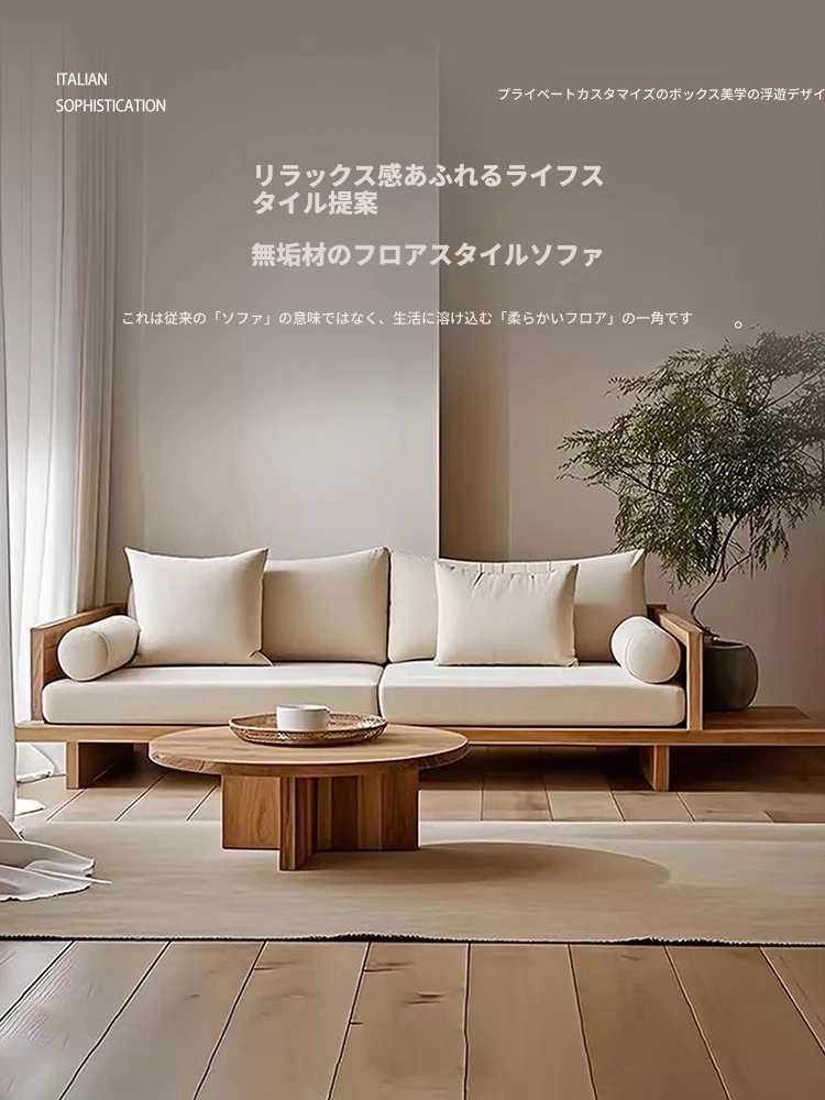 和モダンな侘寂風の本格的な無垢材ソファ|小さなリビングや畳スペースに最適!民宿やホテルの休憩エリアにもぴったり。おしゃれで心地よい空間を演出します。