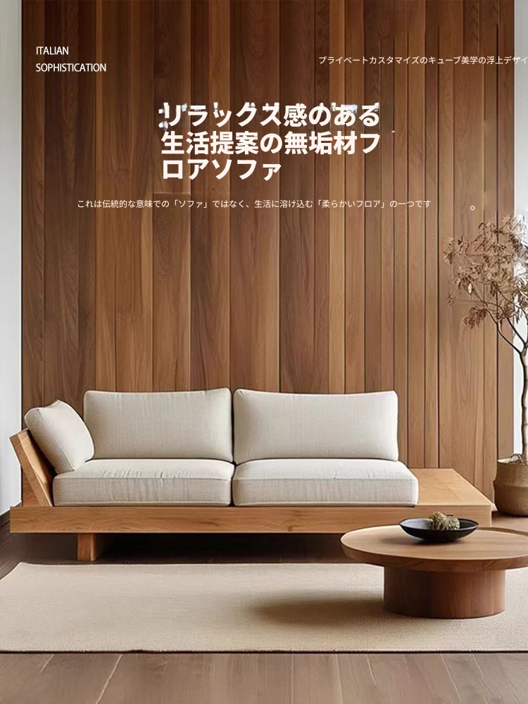 カダ日本式本格無垢材侘び寂び風リビング直置き4人掛けソファー 小型向けファブリックL字型デイベッドコンビネーション - コンパクトでスタイリッシュな空間を演出!