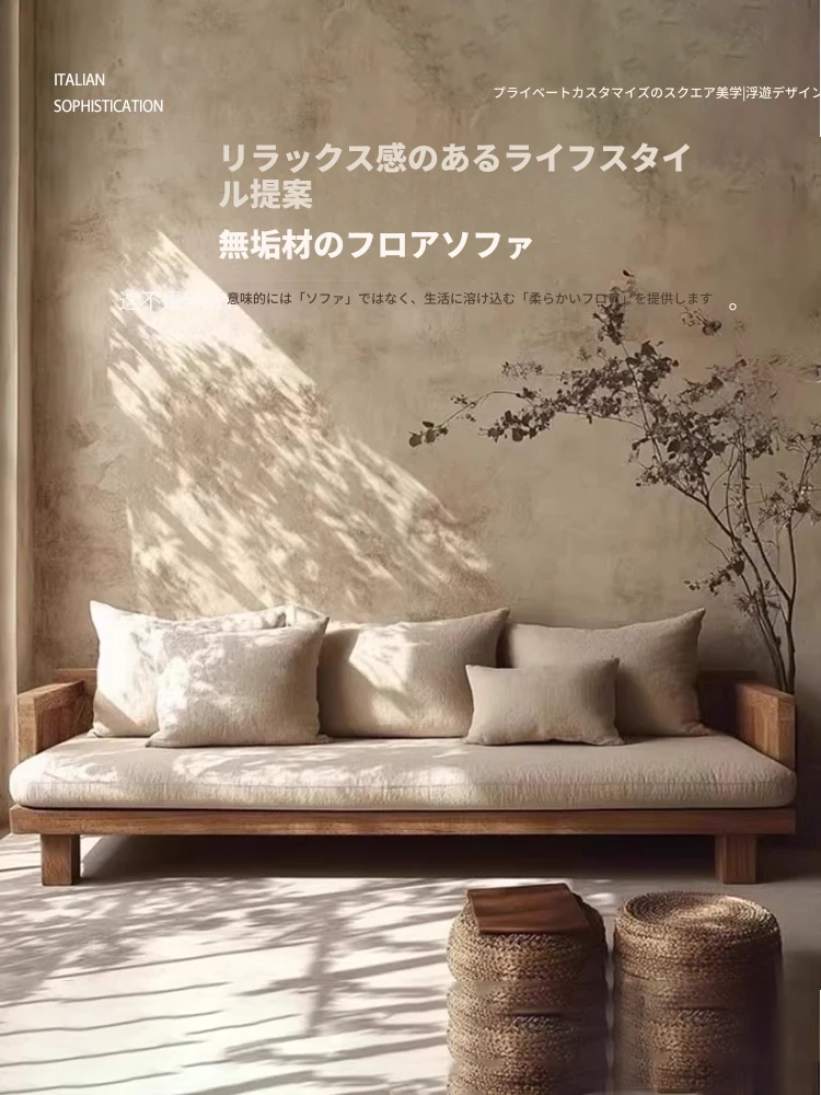中古の和風侘び寂びスタイルの無垢材フロアソファ - 小さなリビングや民宿・ホテルの休憩エリアに最適!取り外し可能なカバーでお手入れ簡単、心地よい空間を演出します。